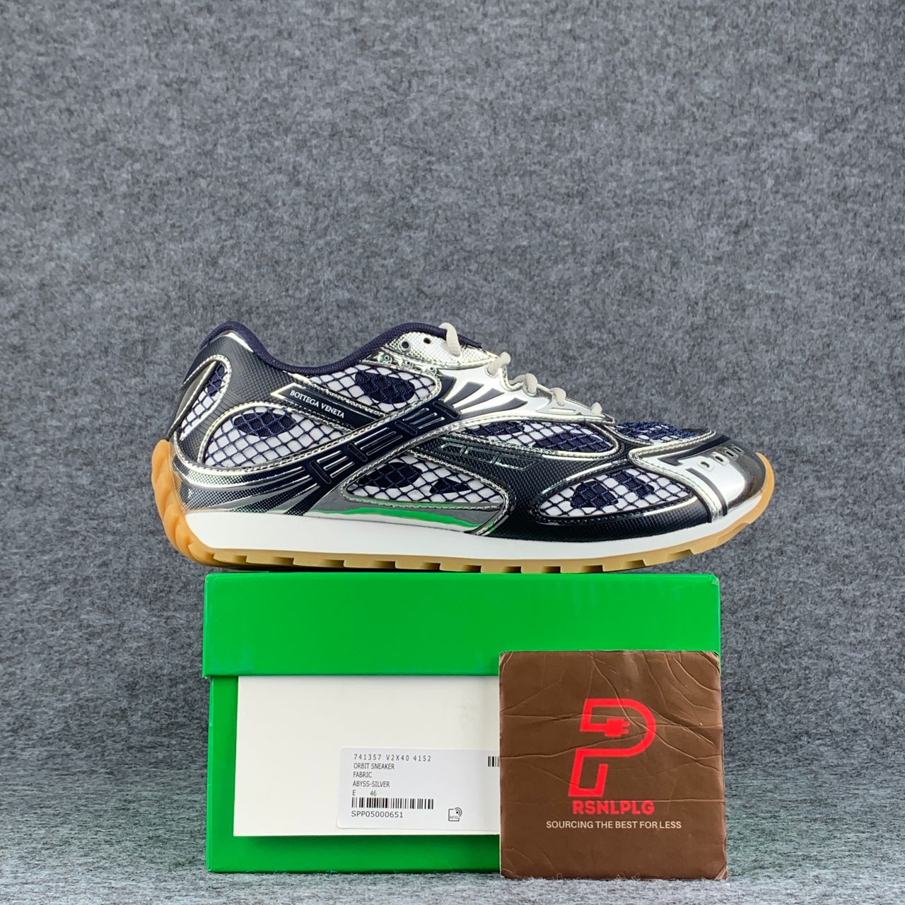 The Bottega Veneta Orbit Sneaker ‘Abyss Silver’ blends a technical running-inspired silhouette with the house’s refined design language. The upper combines breathable mesh with metallic silver overlays and deep green accents, creating a layered and dynamic look. Subtle Bottega Veneta branding appears on the side panel and tongue, while reflective details enhance the futuristic aesthetic. A cushioned midsole and rugged rubber outsole provide everyday comfort and stability, finishing a sleek yet performance-driven sneaker.