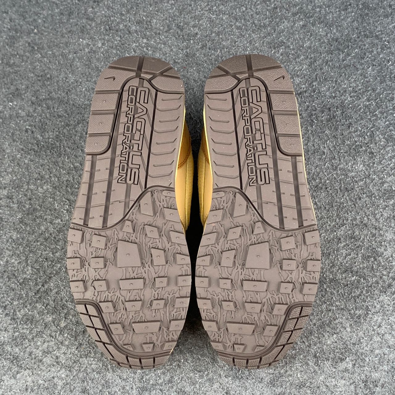Cactus Jack branding appears on the tongue, while a Nike pennant adorns the heel overlay. The sneaker rides on a two-tone foam midsole, supported by a brown rubber outsole with a revised waffled tread.