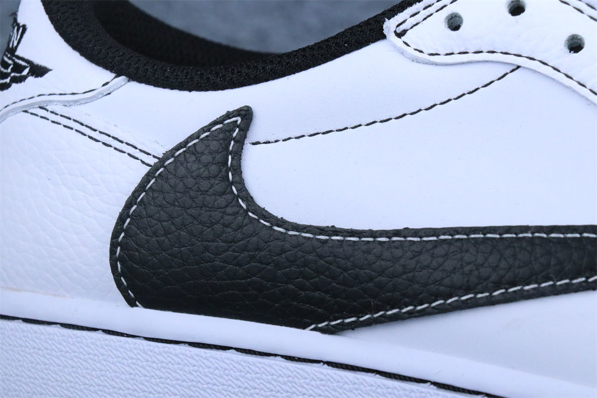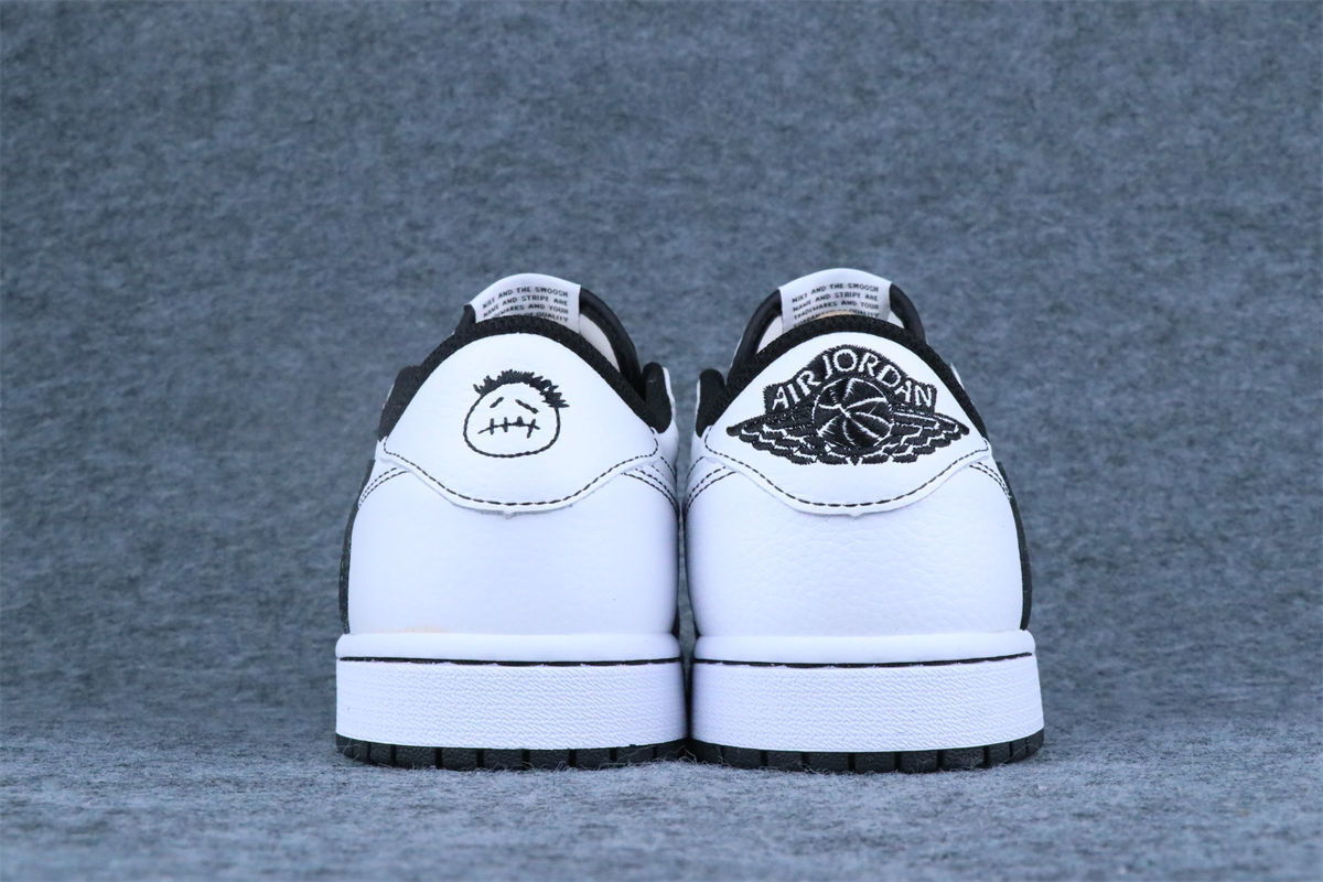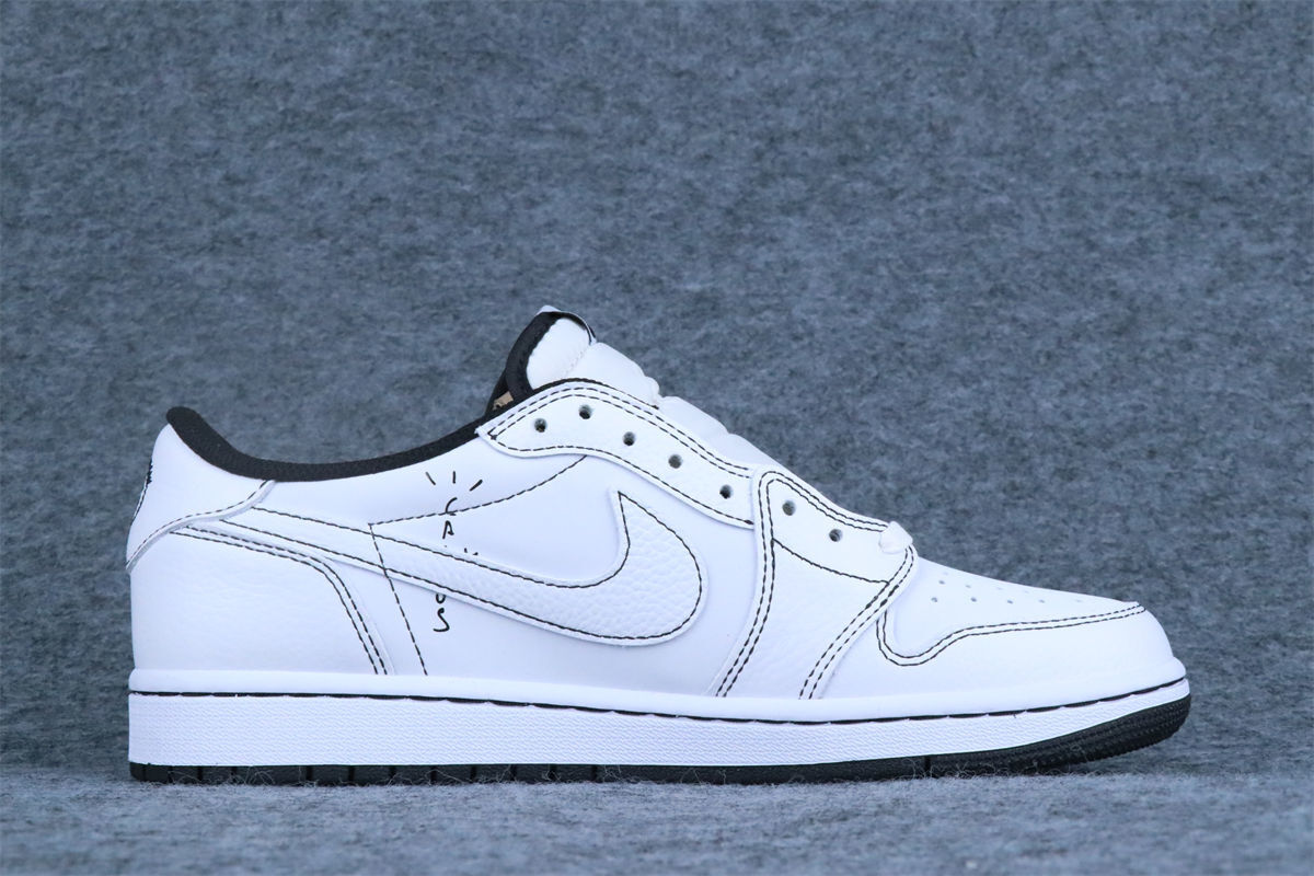 The Travis Scott x Air Jordan 1 Low Custom “Phantom Stitch” delivers a clean, deconstructed take on the iconic silhouette. Built on a crisp white leather upper, the design is defined by bold black contrast stitching and an oversized reversed black Swoosh on the lateral side, a signature Travis Scott detail. Subtle hand-drawn graphics and asymmetric heel branding add a custom, artisanal feel, while the black outsole and collar lining ground the look. Minimal yet expressive, this custom pairs classic Jordan DNA with Travis Scott’s raw, experimental aesthetic.