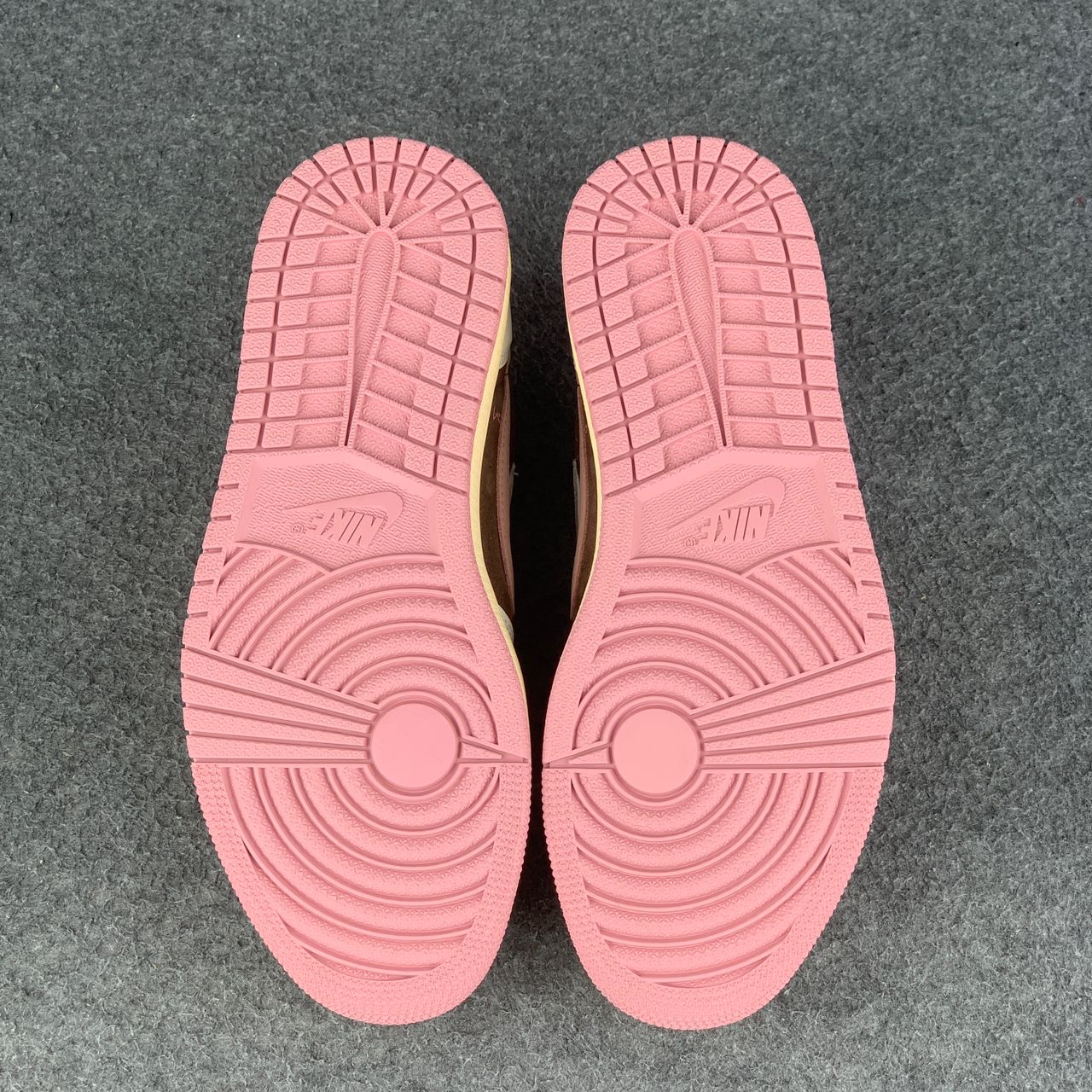 The Travis Scott x Air Jordan 1 Low OG “Dark Pony/Pink Oxford” reimagines the classic silhouette with Travis’s signature reversed Swoosh and premium craftsmanship. The upper features dark brown suede underlays with crisp white leather overlays, contrasted by light pink accents on the Swoosh, laces, and heel branding. A sail midsole and dark brown outsole complete the vintage-inspired look.