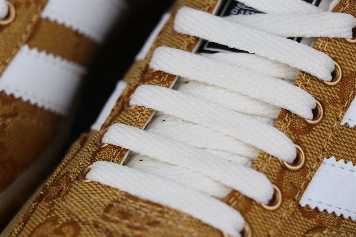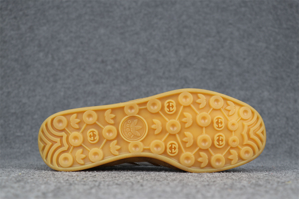 Launching as part of a capsule collection with the luxury fashion house, the Gucci x adidas Gazelle ‘GG Monogram’ is made in Italy and features Alessandro Michele’s elevated take on the heritage silhouette. Gucci’s trademark GG print covers a light brown canvas upper with serrated three-stripes in white leather. A contrasting hit of color appears on the crimson leather heel tab, marked with Gucci Trefoil branding in metallic gold. The sneaker is mounted on a semi-translucent gum rubber cupsole, highlighted by a repeating GG monogram across the sidewalls.