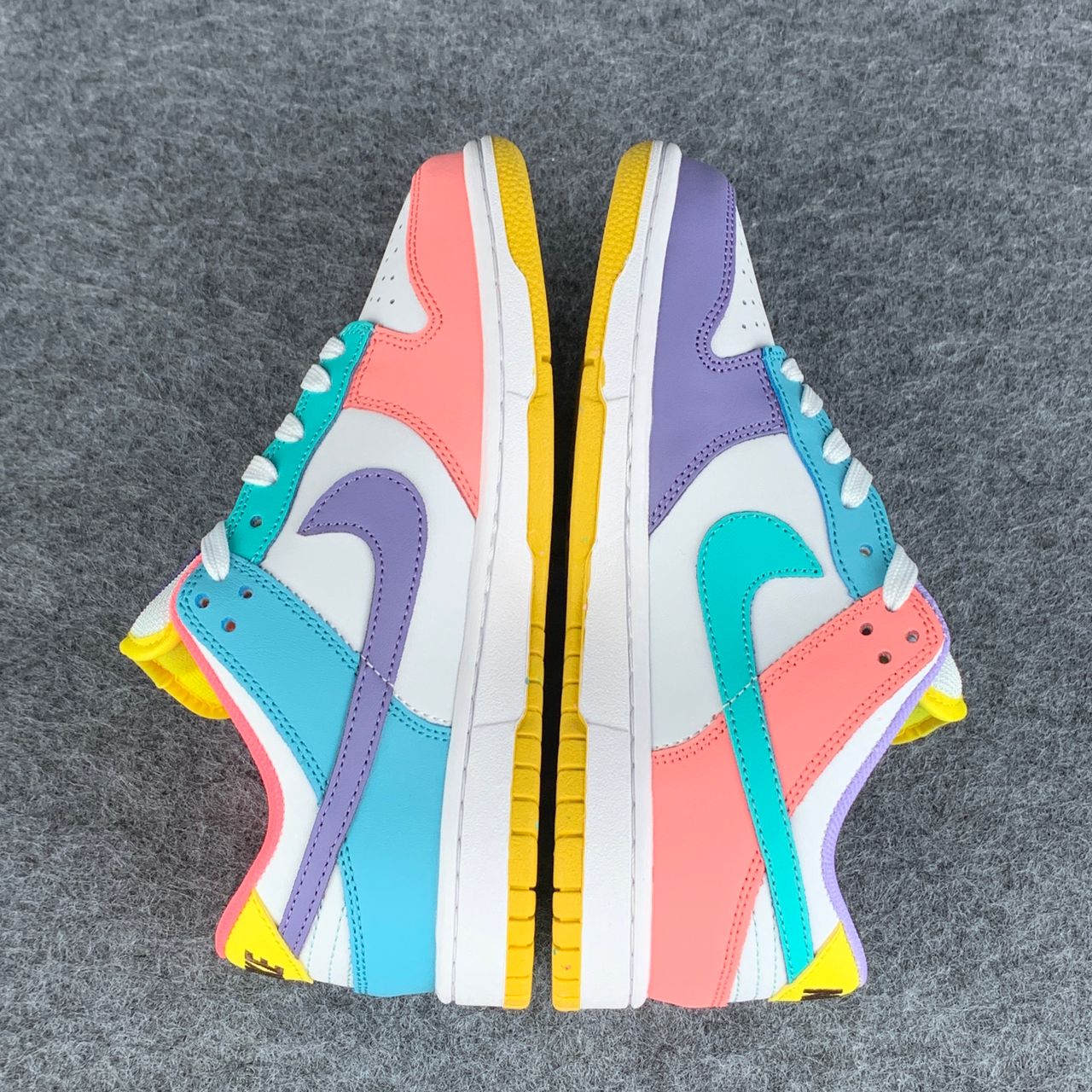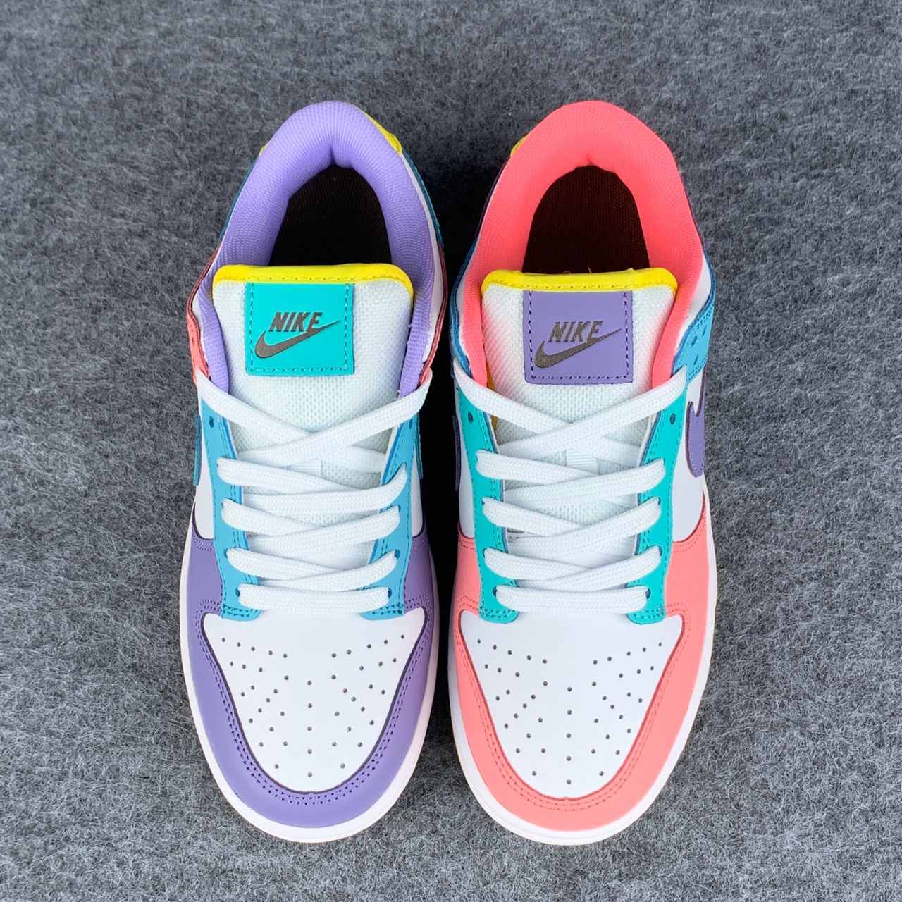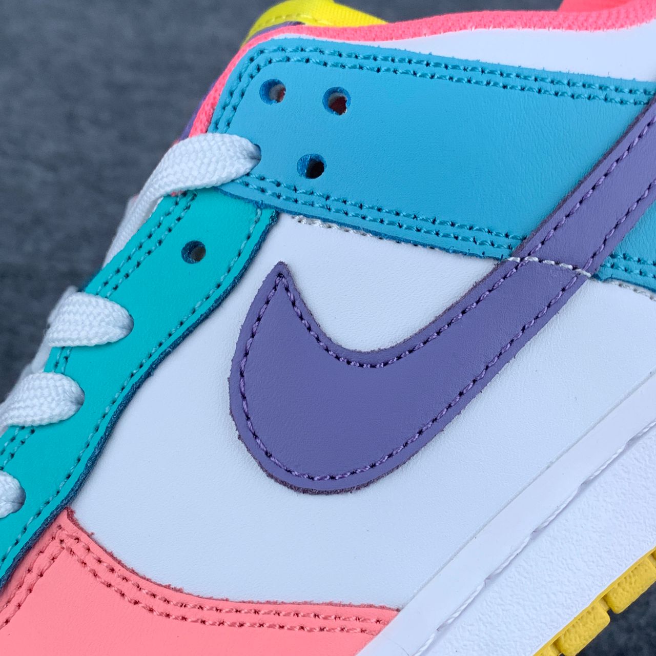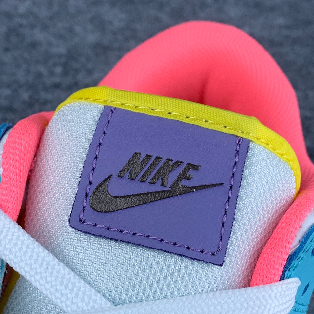 The Nike women’s Dunk Low SE ‘Candy’ updates the vintage basketball shoe with an eye-catching medley of colors. The low-tops showcases a unique color blocking, highlighted by a white leather base with mismatched accents — including Purple Pulse, Sunset Pulse, Lagoon Pulse and Green Glow — throughout the sneaker’s overlays, Swooshes, Nike-branded tongue tags and mesh collar linings. The rubber cupsole pairs white sidewalls with a speckled yellow outsole.