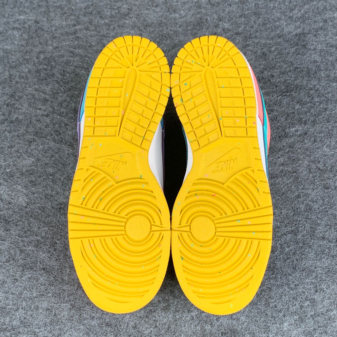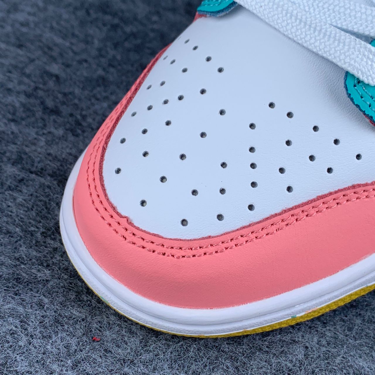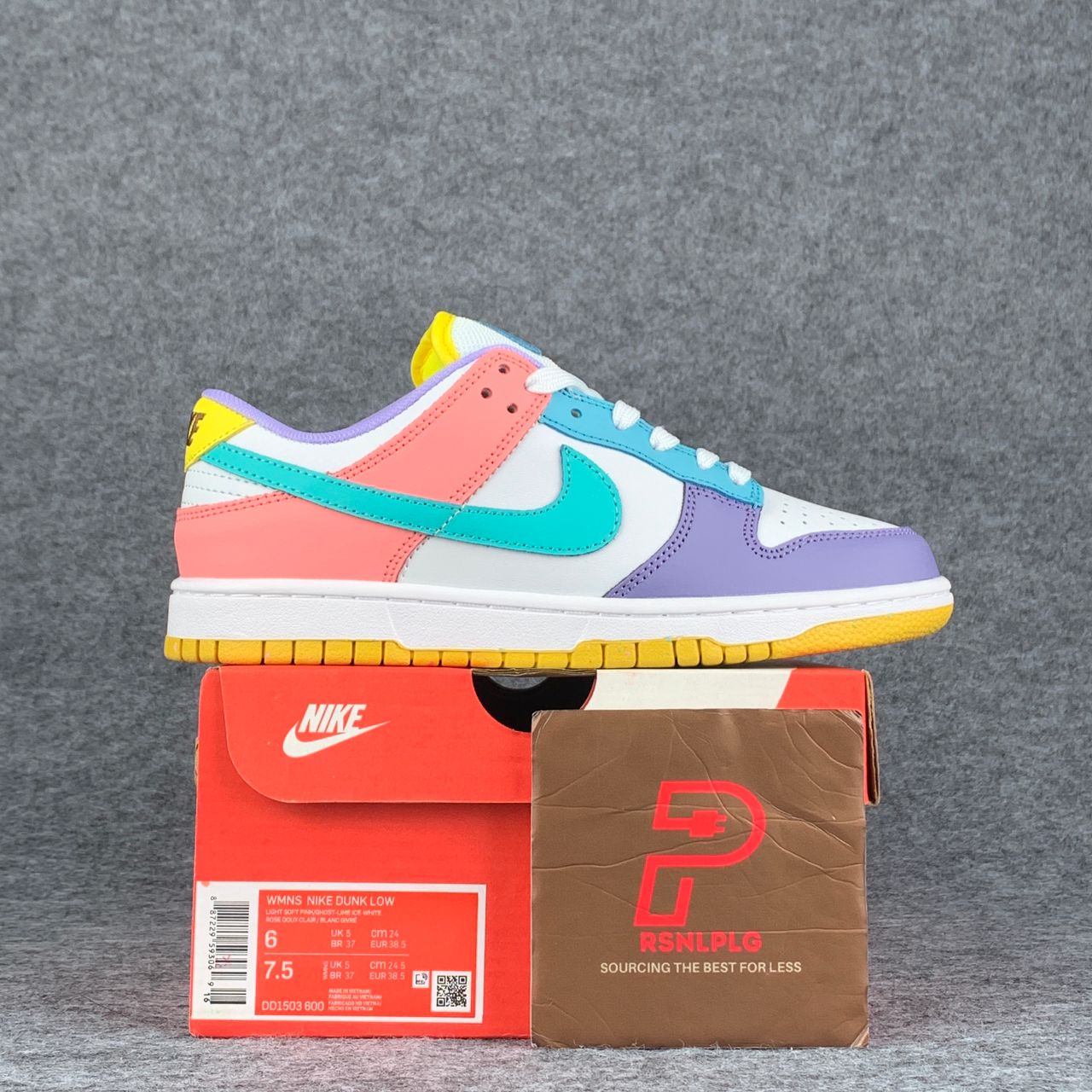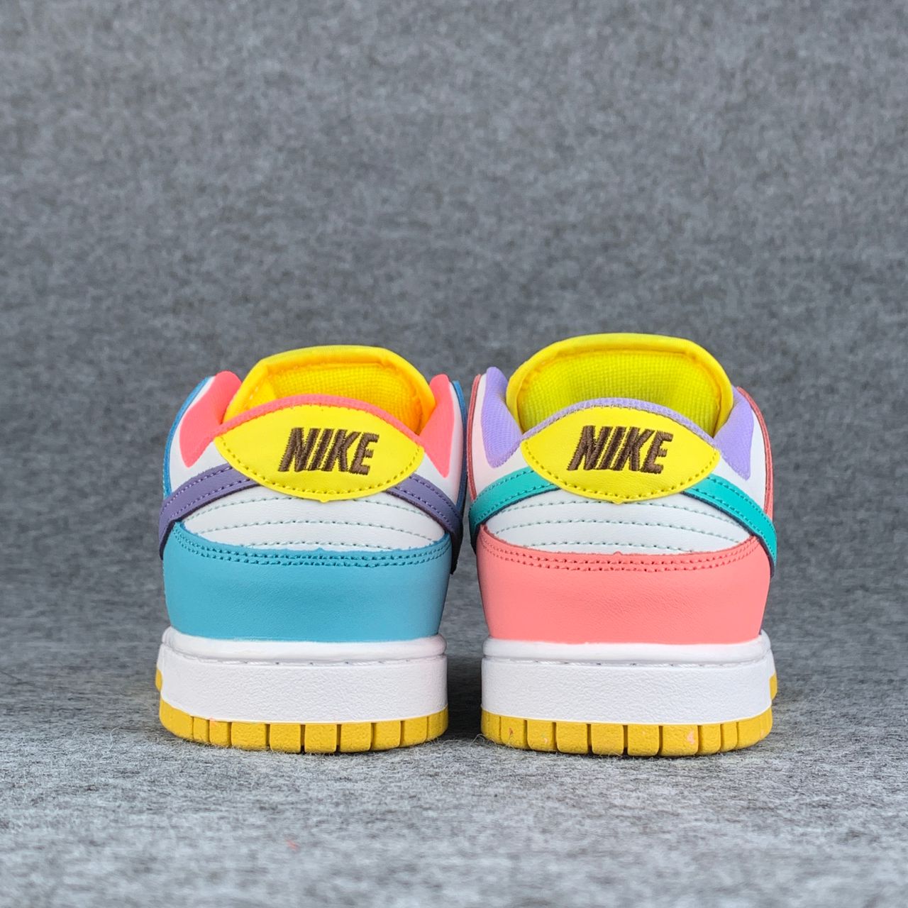 The Nike women’s Dunk Low SE ‘Candy’ updates the vintage basketball shoe with an eye-catching medley of colors. The low-tops showcases a unique color blocking, highlighted by a white leather base with mismatched accents — including Purple Pulse, Sunset Pulse, Lagoon Pulse and Green Glow — throughout the sneaker’s overlays, Swooshes, Nike-branded tongue tags and mesh collar linings. The rubber cupsole pairs white sidewalls with a speckled yellow outsole.