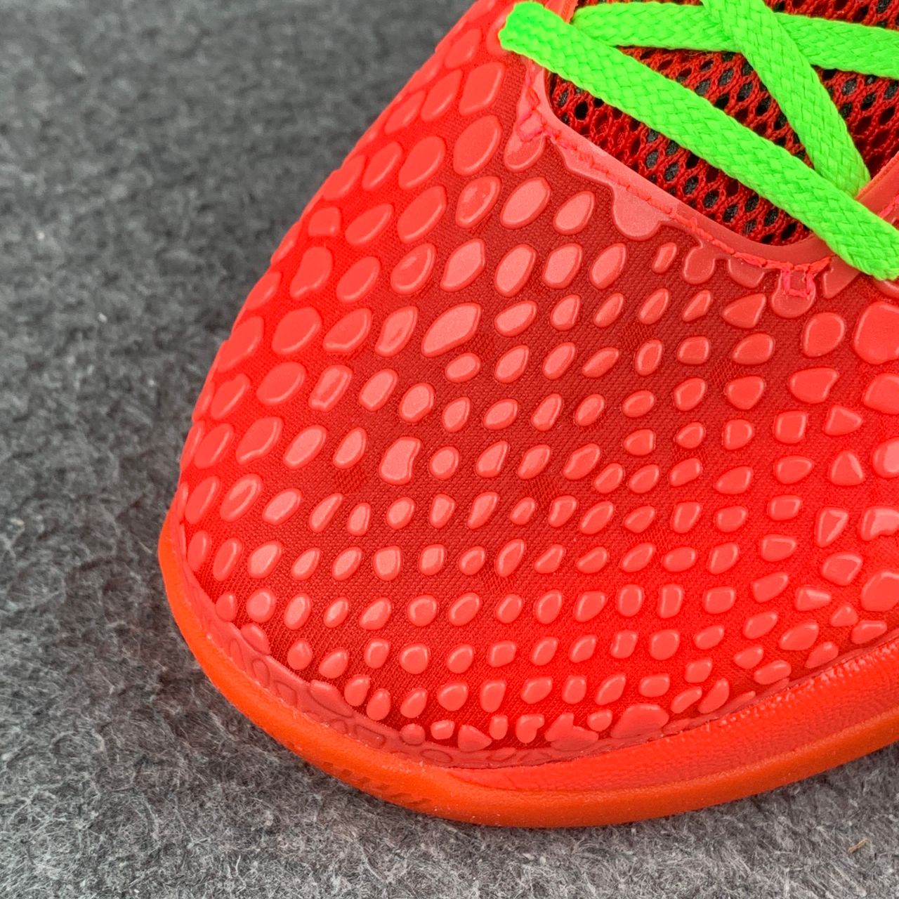 The Nike Zoom Kobe 6 Protro ‘Reverse Grinch’ delivers a color-inverted version of the iconic ‘Grinch’ colorway from 2010. A bright crimson color is executed on the scaly micro-mesh upper, secured with neon green laces and accented with a contrasting black Swoosh. A padded low-cut collar allows for maximum range of motion, while a molded TPU heel counter provides rearfoot stability. The sneaker sits on a lightweight Cushlon midsole with a springy Zoom Air unit nestled in the forefoot.