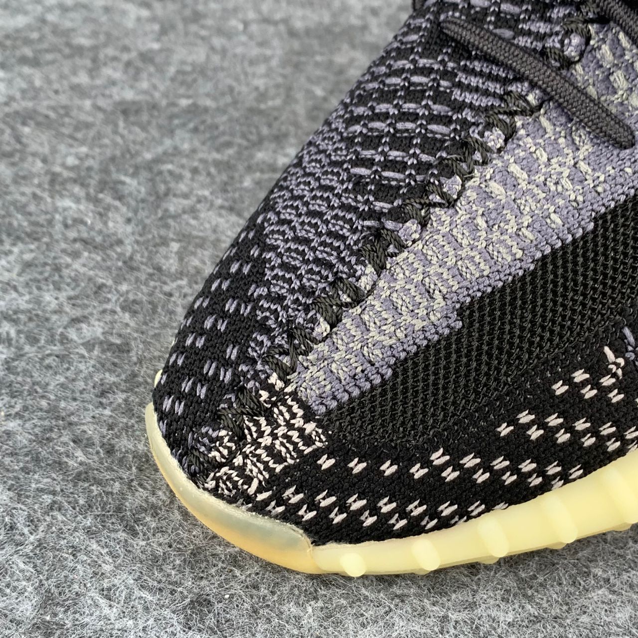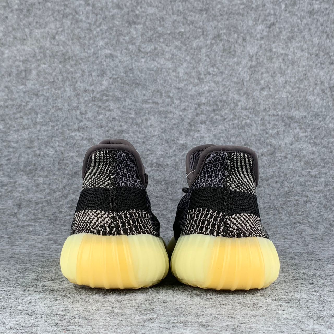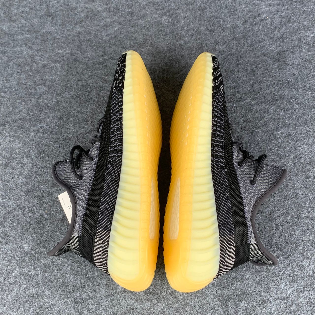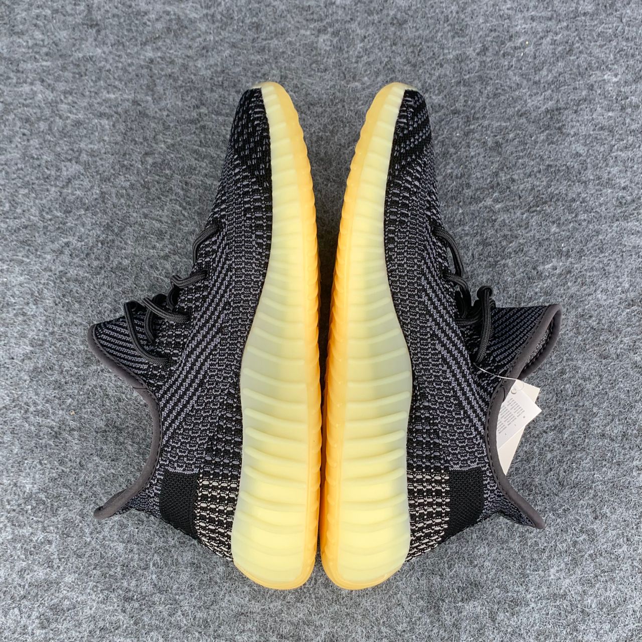 L'adidas Yeezy Boost 350 V2 'Carbon' est dotée d'une tige Primeknit respirante dans une finition neutre noire et grise. Le côté latéral de la sneaker présente une traînée de noir via la bande latérale en monofilament post-teinte, séparant un tissage gris clair sur le dessus avec une construction principalement noire sur la moitié inférieure. Les lacets élastiques sans nœud offrent un ajustement sûr. La sneaker repose sur une semelle intercalaire Boost sur toute la longueur, entourée d’une cage en caoutchouc teintée de jaune.