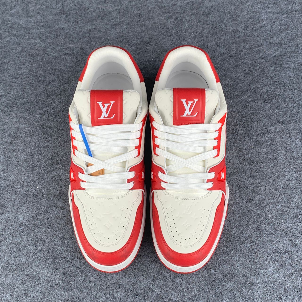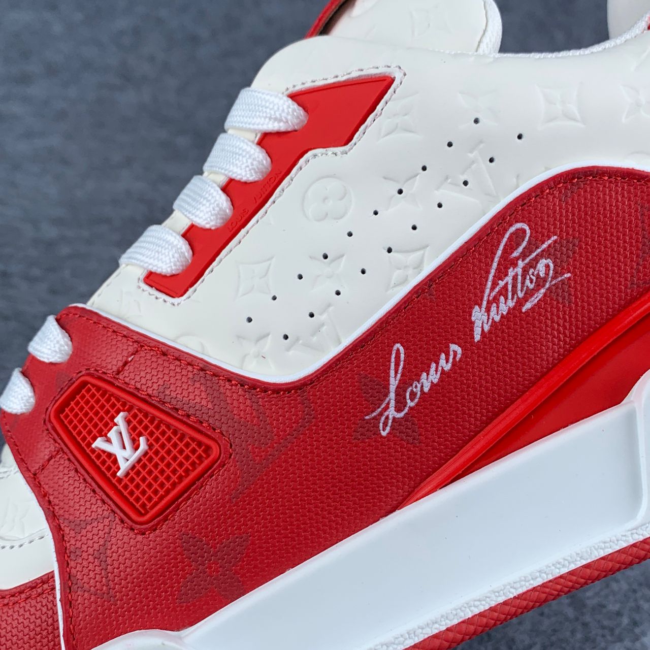 The LV Trainer Low “#54 Signature – Red White” brings bold color-blocking to Louis Vuitton’s iconic sneaker. Crafted from premium calf leather, the upper combines bright red and clean white panels with layered overlays that highlight the silhouette’s sporty design. The tongue and side panels feature LV branding, while the heel showcases the #54 signature a tribute to the year Louis Vuitton began producing footwear.