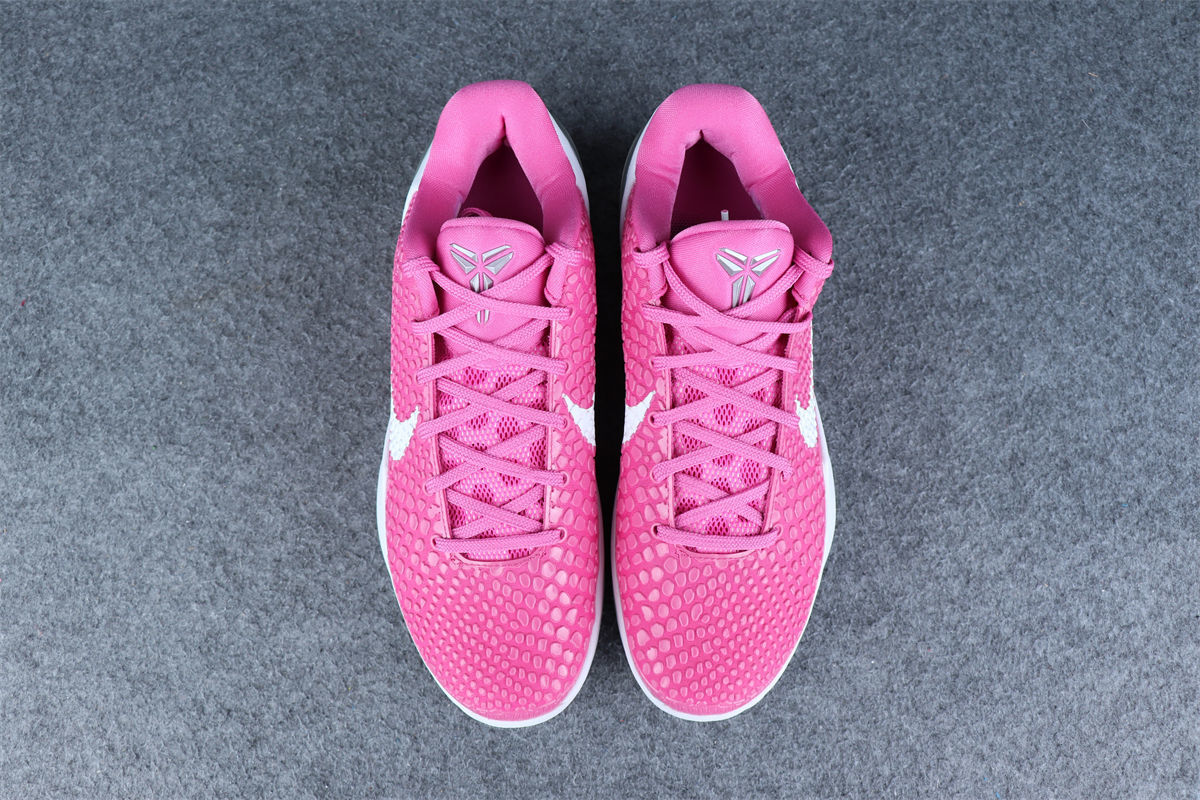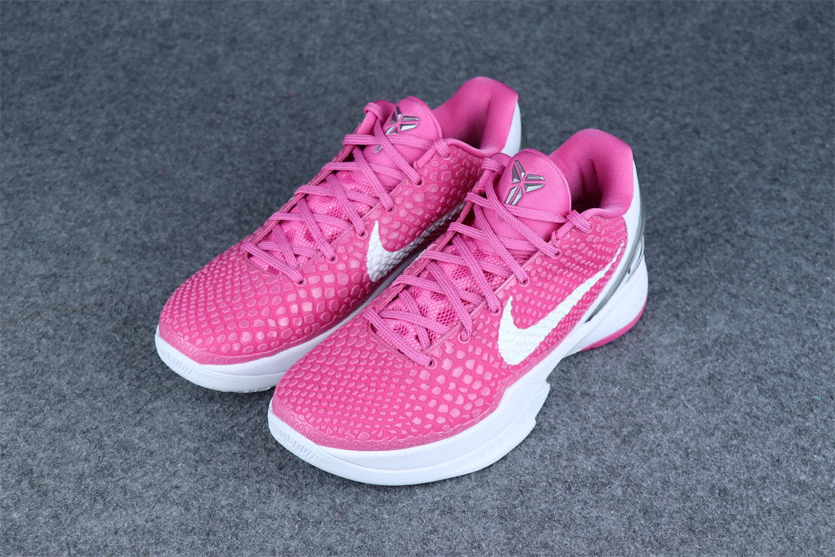 The 2021 Kobe 6 Protro Kay Yow “Think Pink” revives the iconic Kobe silhouette in a vibrant Pinkfire finish honoring the Kay Yow Cancer Fund. It features the signature snakeskin-textured upper, updated Protro Zoom Air cushioning for improved responsiveness, and a supportive, low-profile fit built for quick, explosive movement. White and black accents balance the bold design, while the breast cancer awareness ribbon on the heel highlights the shoe’s meaningful purpose.