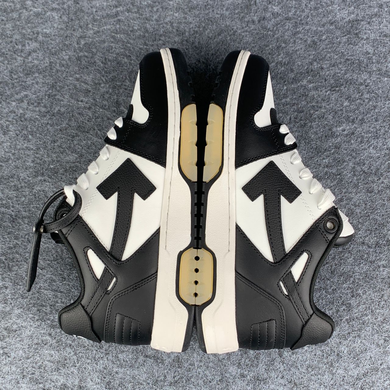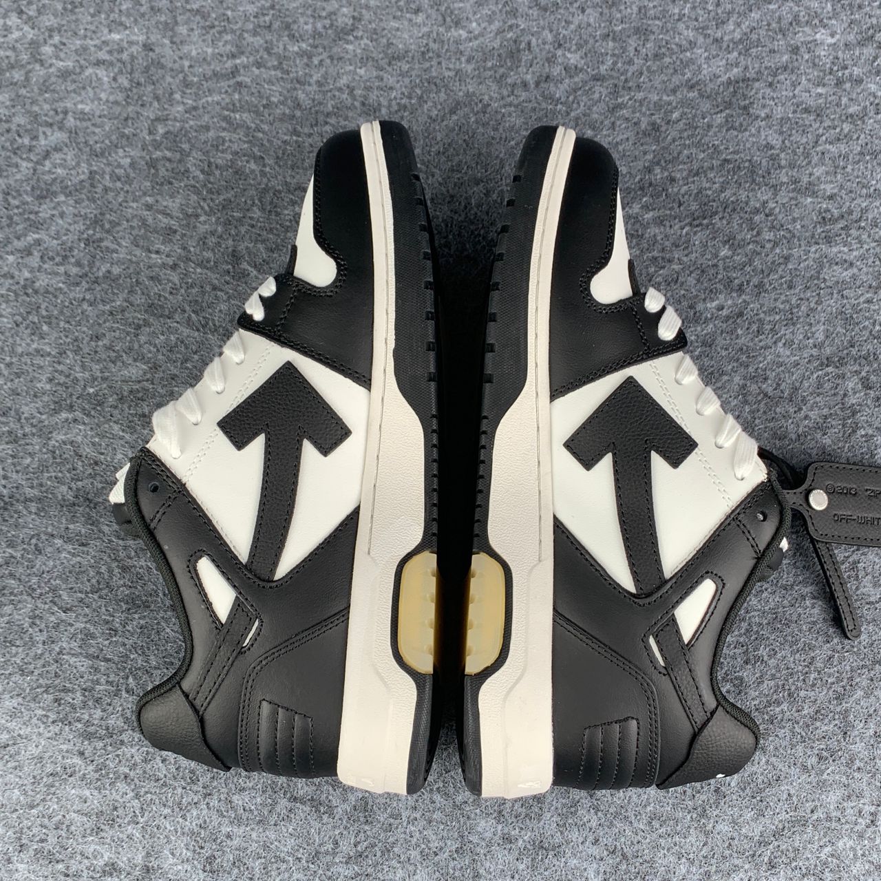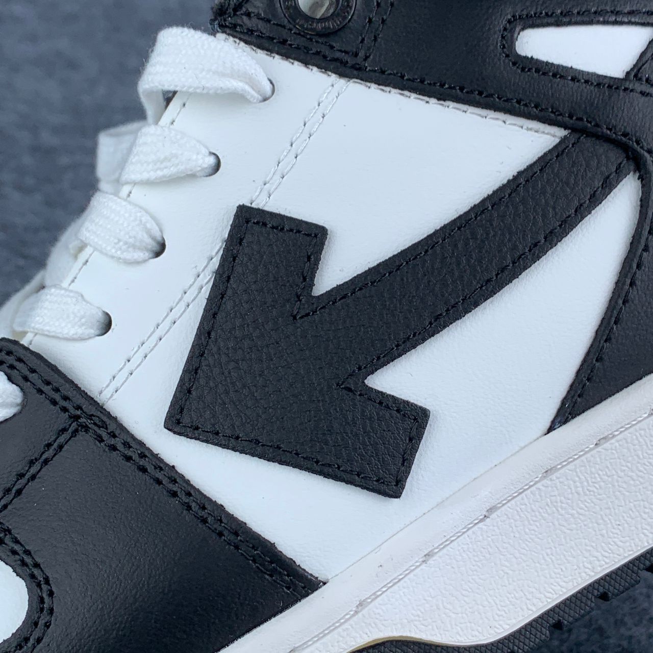 The Off-White Out of Office 'White Black White feature a smooth white leather upper accented by black overlays and a black arrow logo, creating a sharp contrast across the silhouette. Signature elements like the padded collar, perforated toe box, and exposed stitching maintain the classic OOO look, while the white rubber cupsole completes the clean two-tone design.
