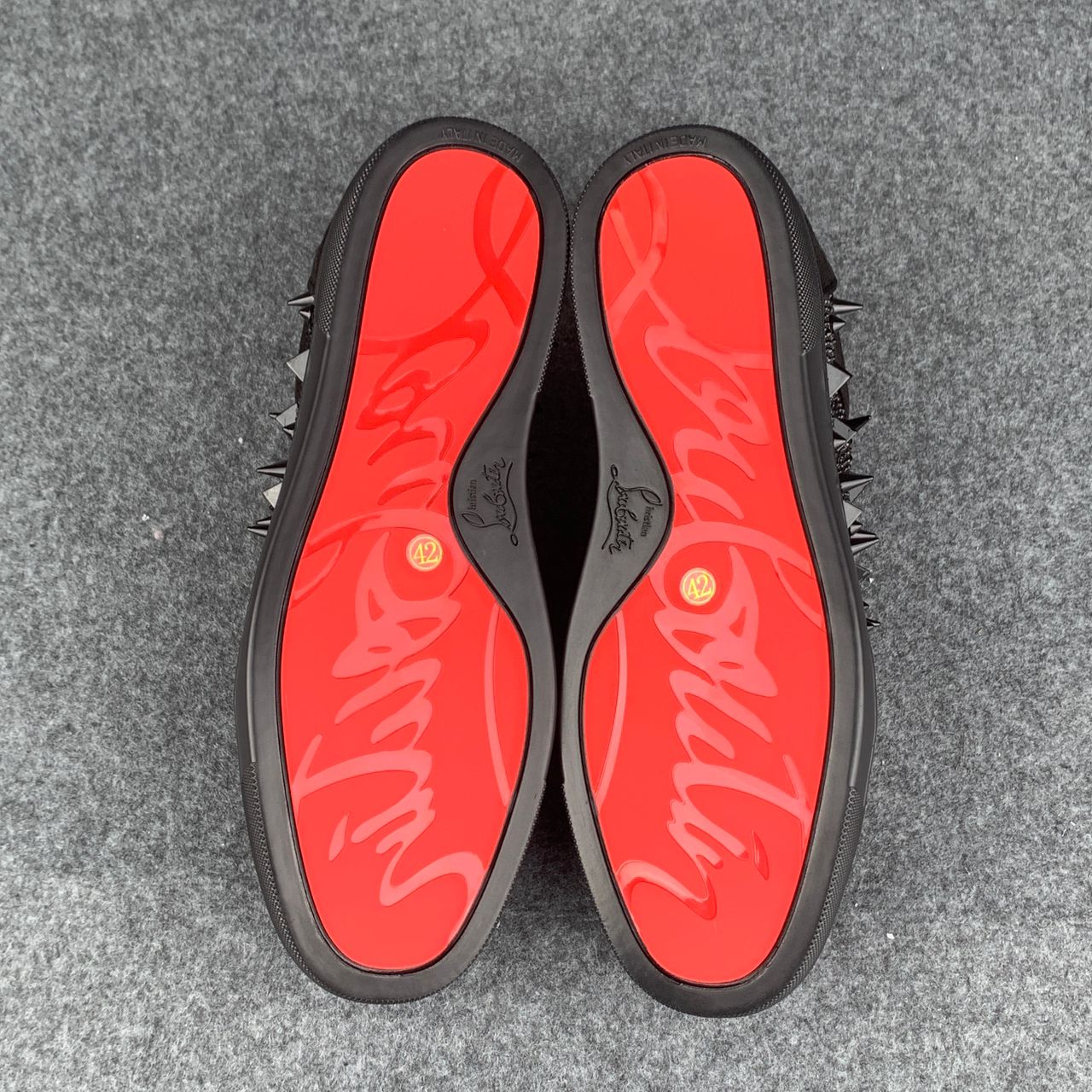 Underfoot, a durable black rubber sole completes the look with everyday versatility, while the interior features plush leather lining for long-lasting comfort. Finishing touches include subtle metallic accents and Louboutin’s signature red-bottom attitude, making this pair a statement piece from every angle.