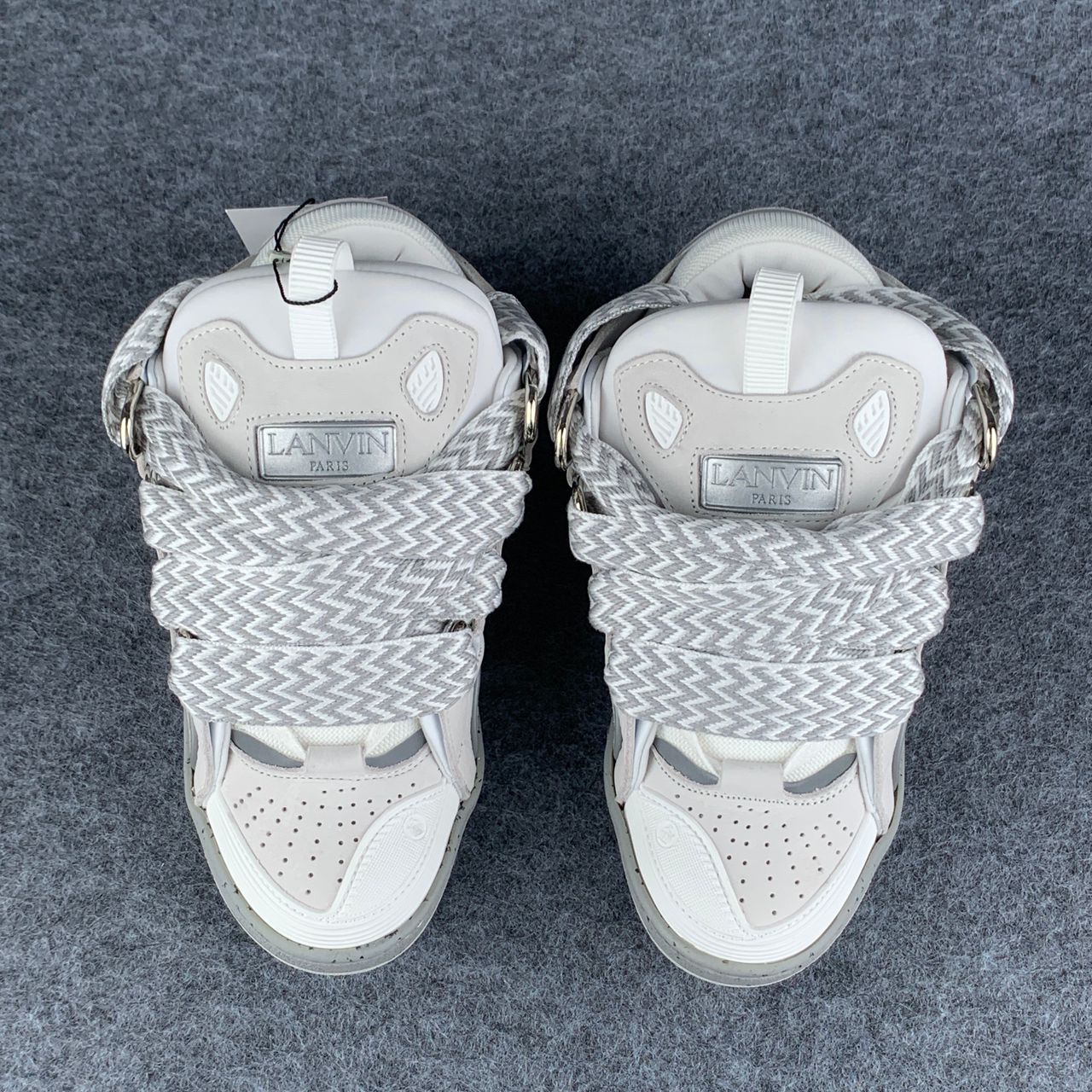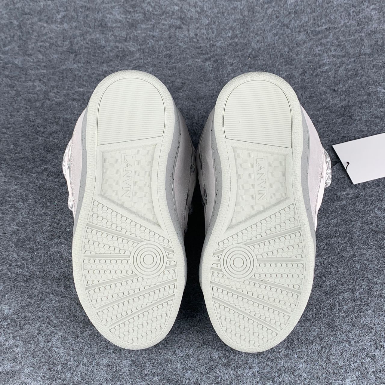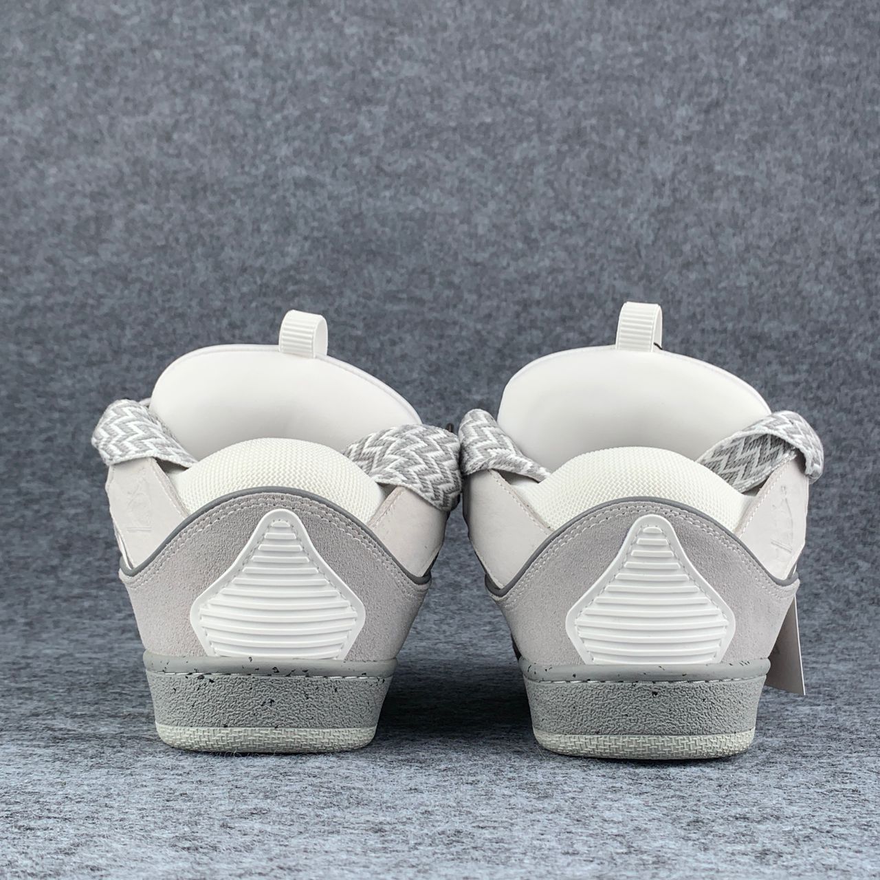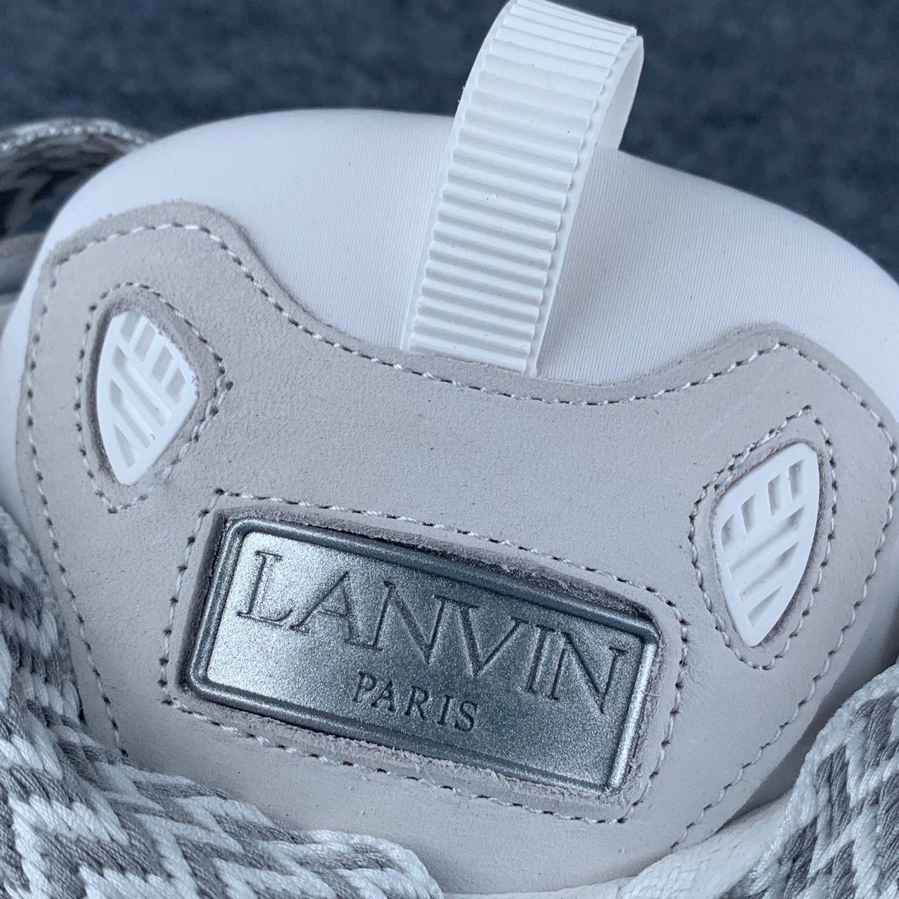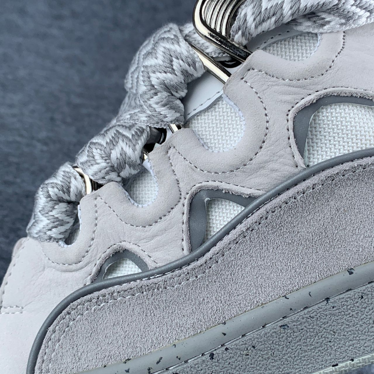 The Lanvin Curb Sneakers in 'Grey White' are a bold, '90s-inspired design featuring exaggerated proportions and intricate detailing. Crafted from premium materials such as nappa calfskin, suede, and mesh, these sneakers offer both durability and comfort. Distinctive elements include waxed, woven double laces with a herringbone motif, a quilted tongue adorned with the Lanvin label and embossed Mother and Child logo, and curved metallic eyelets. The rounded silhouette and padded tongue enhance comfort, while the durable rubber outsole ensures traction. Made in Portugal, these sneakers exemplify Lanvin's commitment to quality and craftsmanship