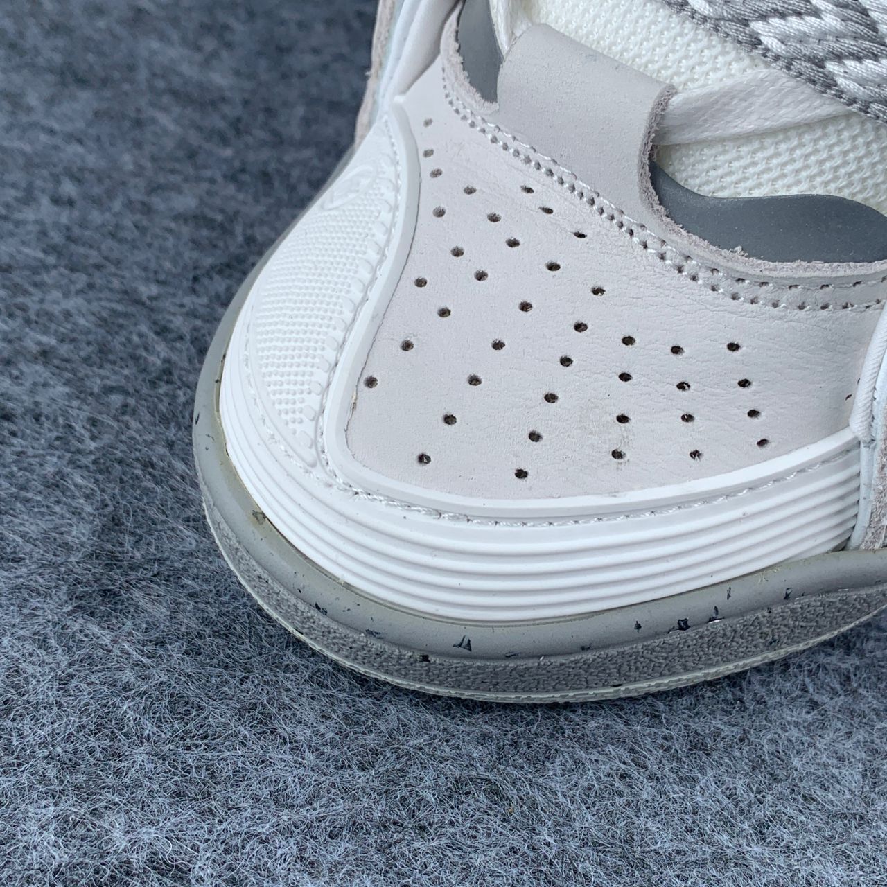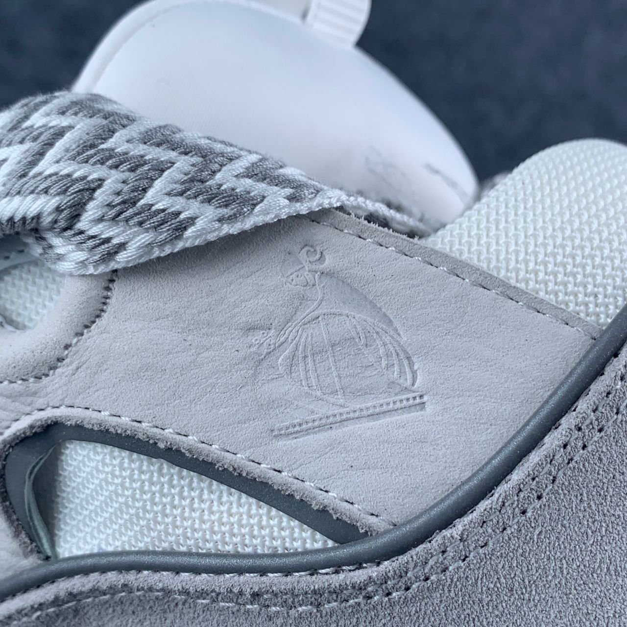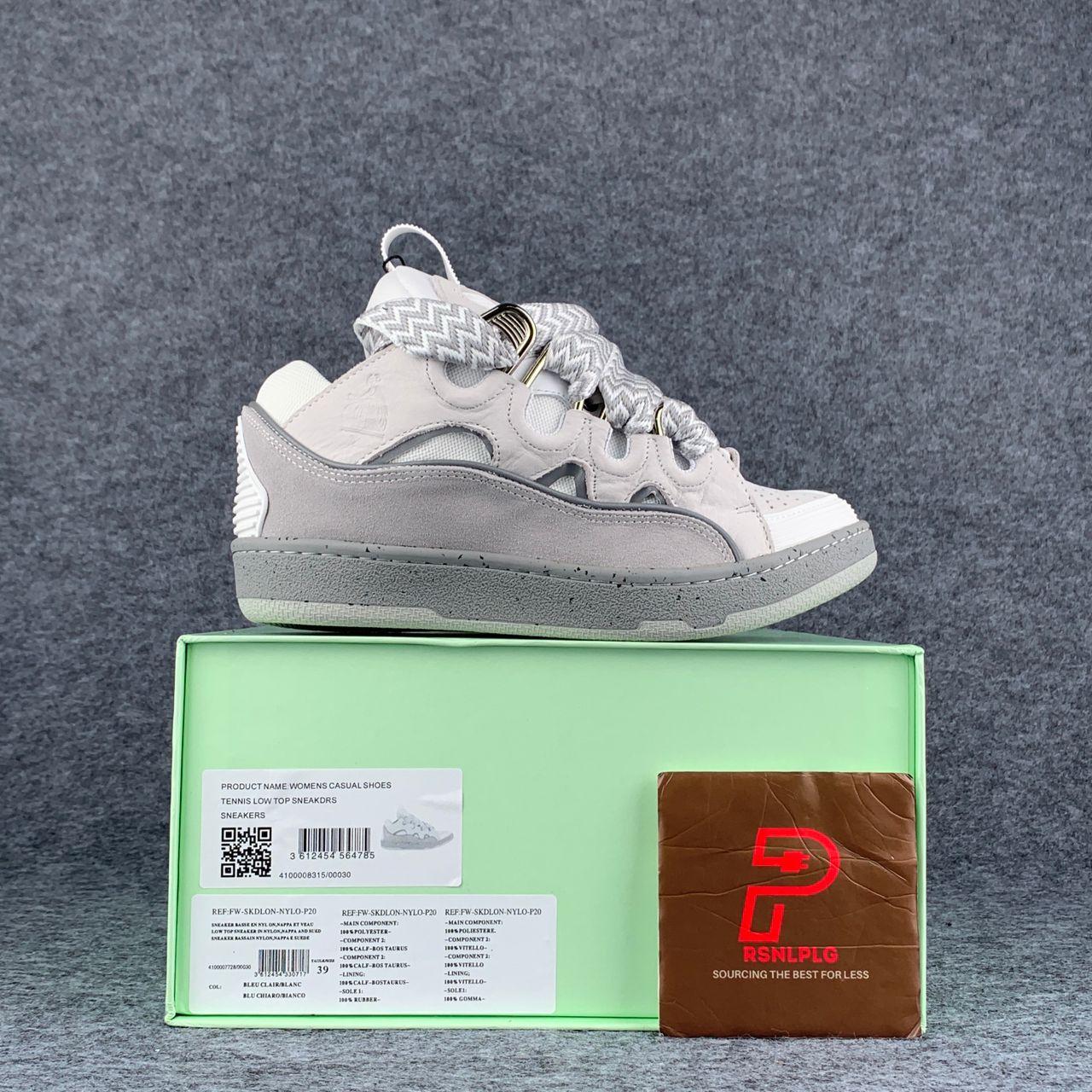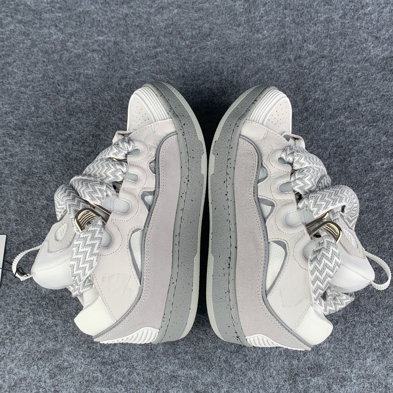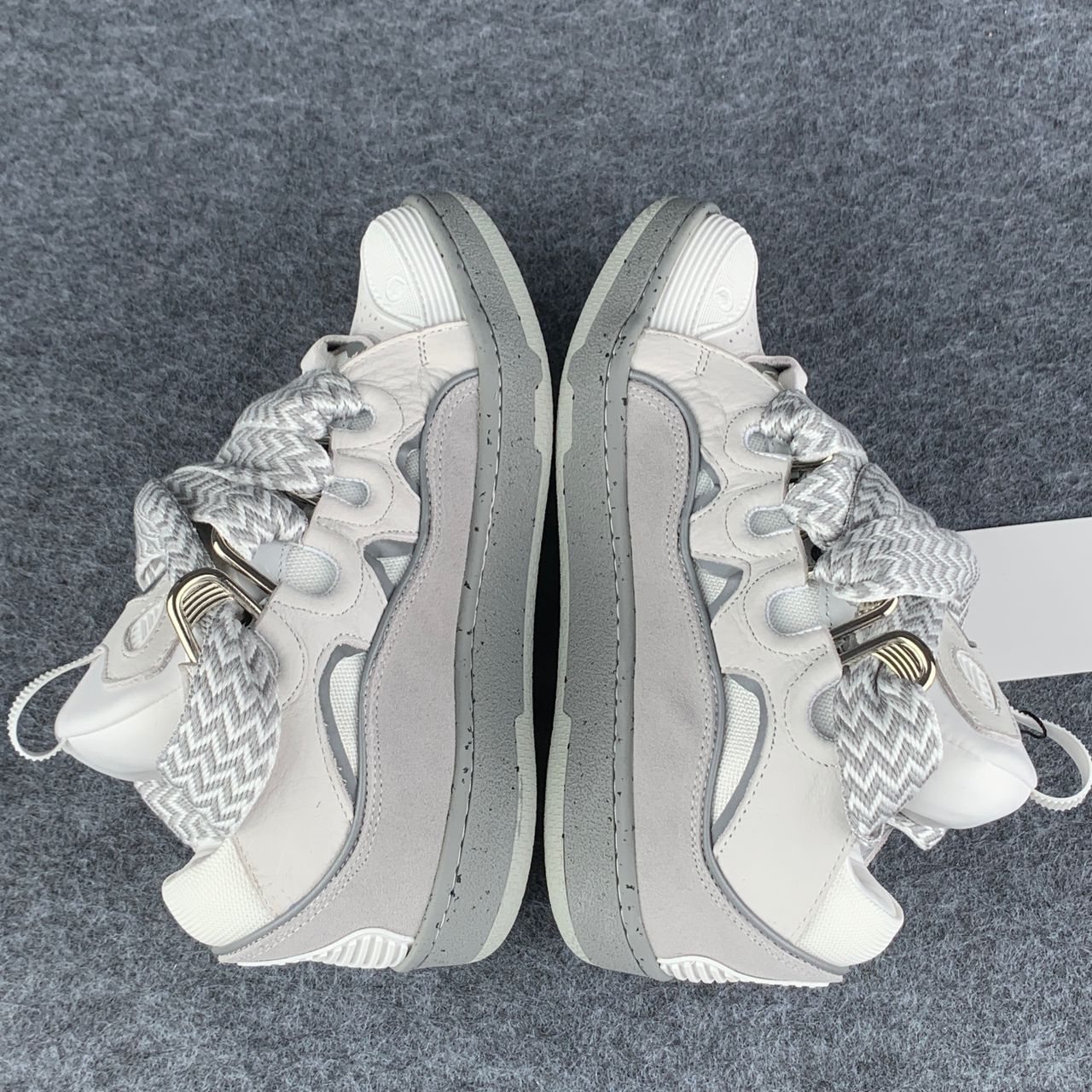 The Lanvin Curb Sneakers in 'Grey White' are a bold, '90s-inspired design featuring exaggerated proportions and intricate detailing. Crafted from premium materials such as nappa calfskin, suede, and mesh, these sneakers offer both durability and comfort. Distinctive elements include waxed, woven double laces with a herringbone motif, a quilted tongue adorned with the Lanvin label and embossed Mother and Child logo, and curved metallic eyelets. The rounded silhouette and padded tongue enhance comfort, while the durable rubber outsole ensures traction. Made in Portugal, these sneakers exemplify Lanvin's commitment to quality and craftsmanship