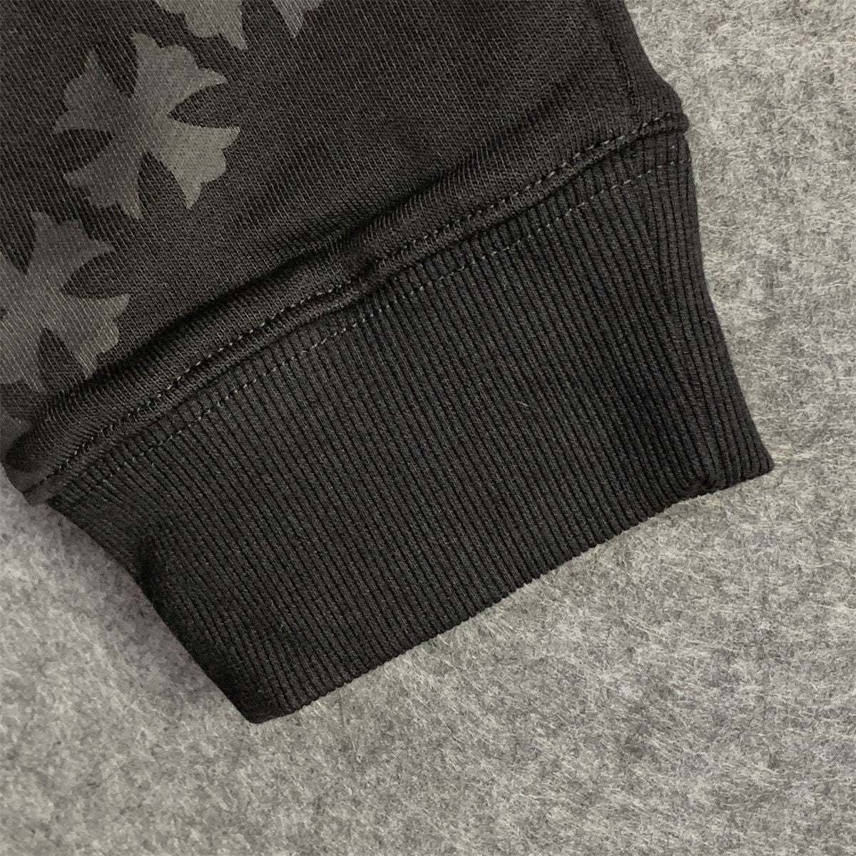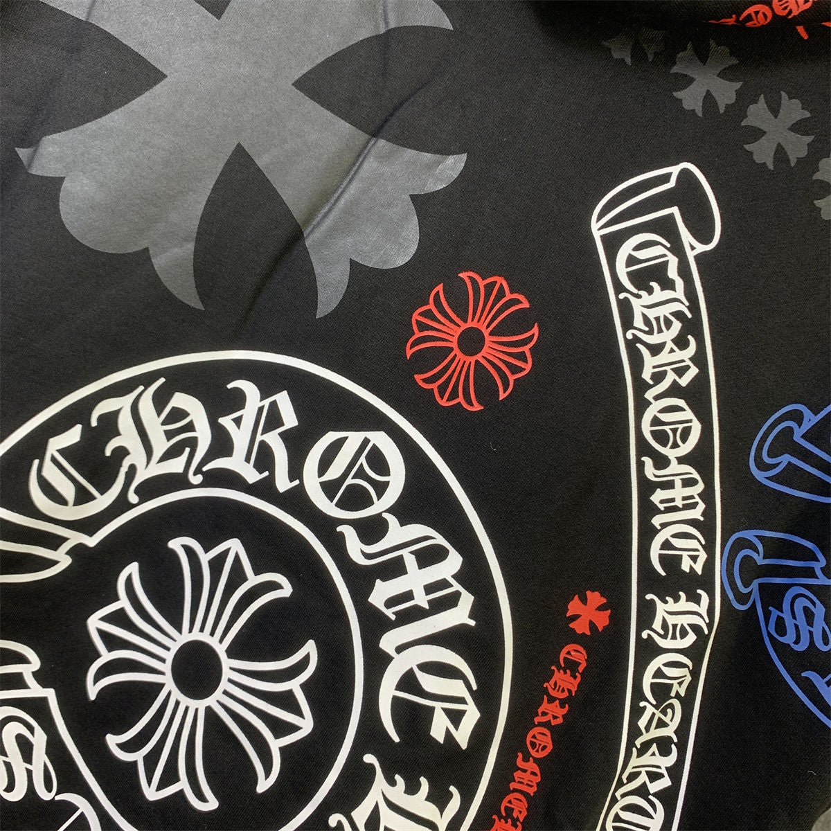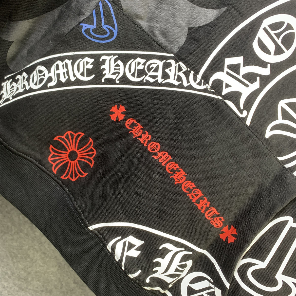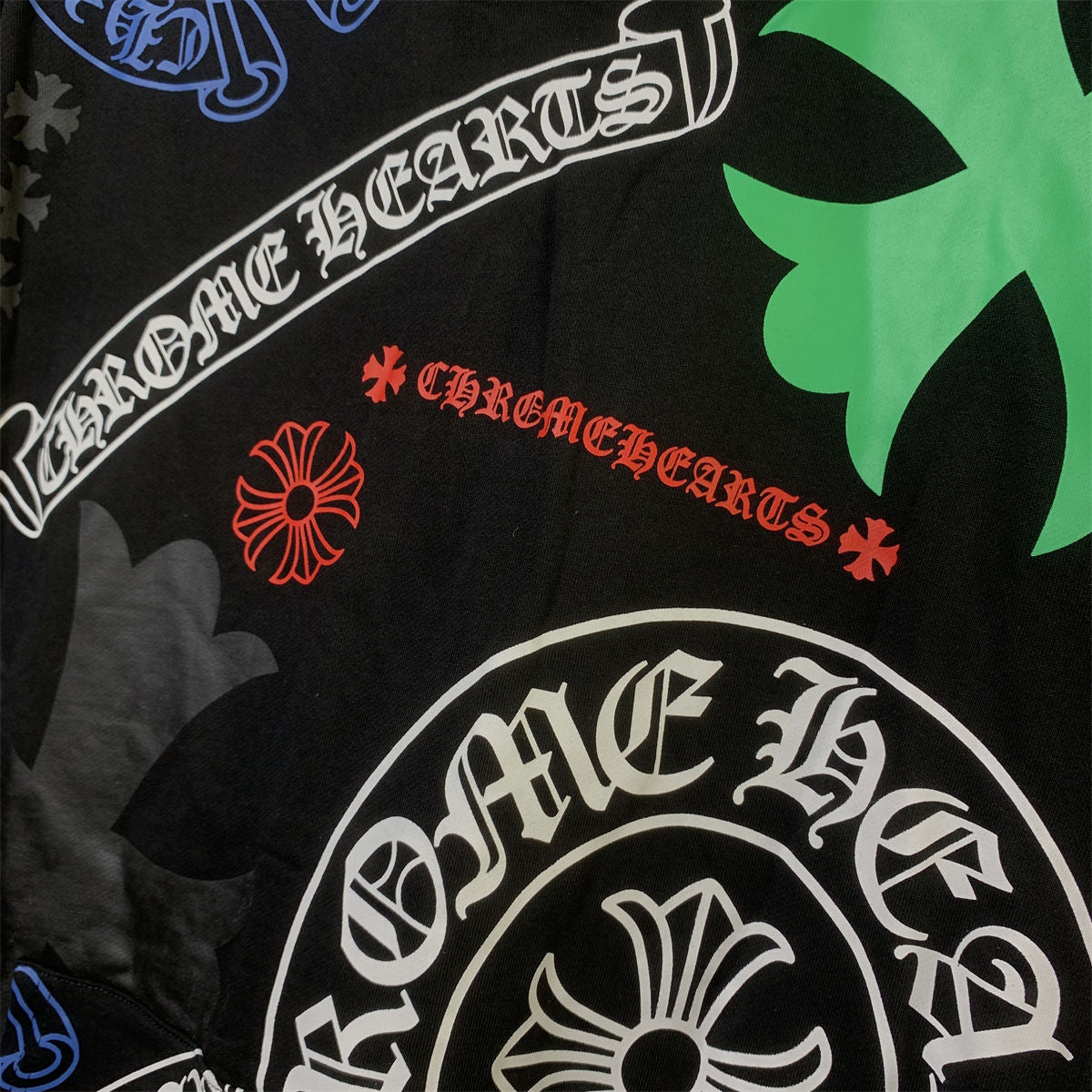 Pullover hoodie featuring an all-over stencil-style graphic layout that covers the front, back, sleeves, and hood. The design combines oversized Chrome Hearts horseshoe emblems, cross motifs, and gothic text rendered in contrasting white, red, blue, green, and grey tones against a black base. Layered graphics overlap and vary in scale, creating a collage-like effect that gives the piece visual depth from every angle. Finished with a kangaroo pocket, ribbed cuffs and hem, adjustable drawstring hood, and internal Chrome Hearts labeling. A bold, fully printed Chrome Hearts hoodie with no blank panels, designed to stand out through dense graphic coverage rather than a single focal logo.