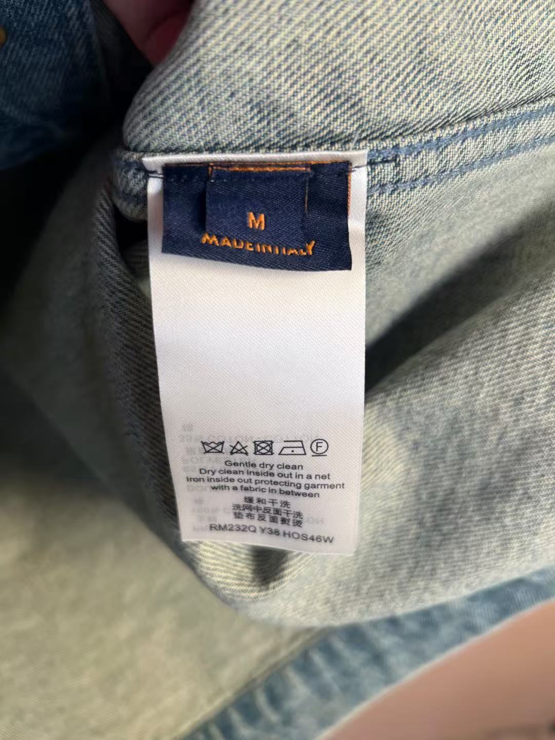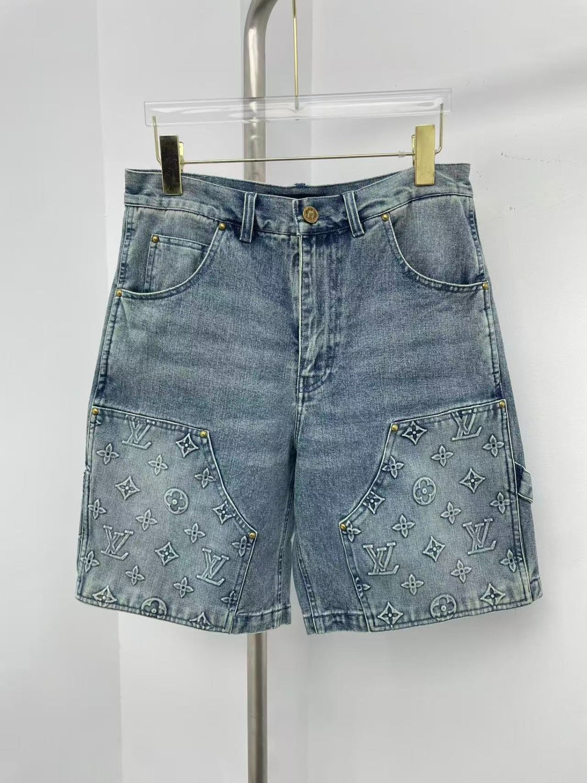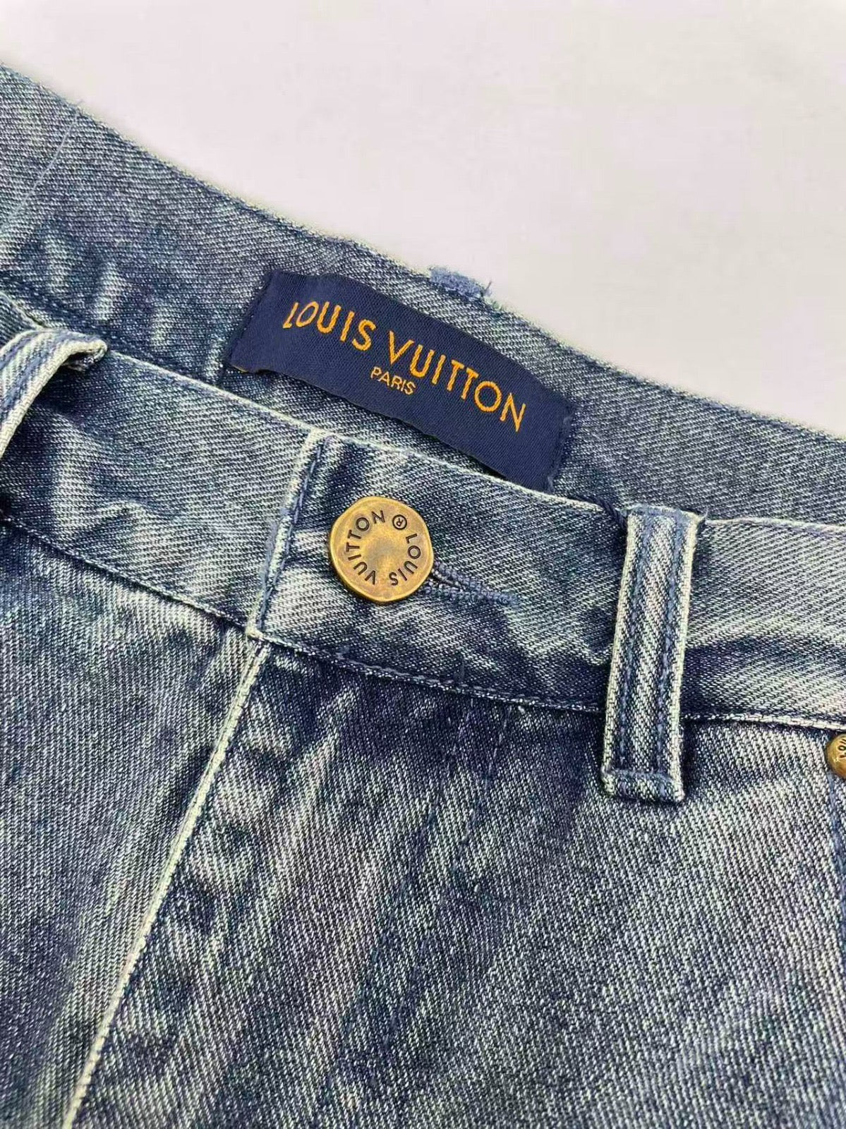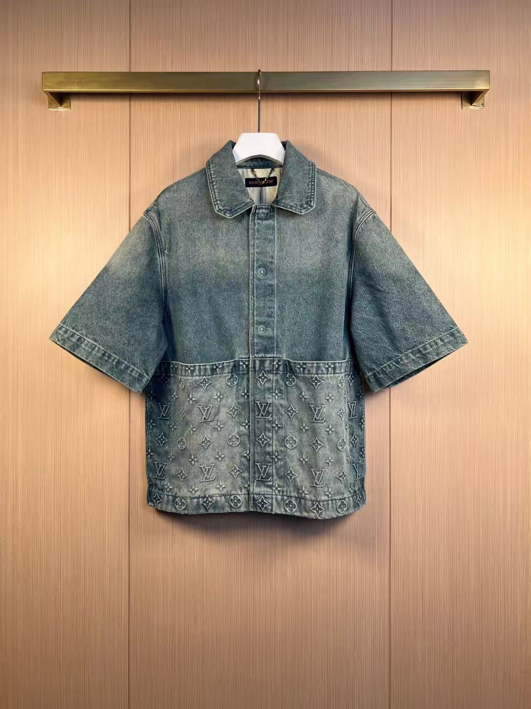 This Louis Vuitton washed denim workwear set features a short-sleeve denim shirt paired with matching carpenter shorts. Crafted in a faded blue wash, the set showcases contrasting Louis Vuitton monogram detailing on the lower panels, adding a distinctive signature touch to a classic workwear silhouette.