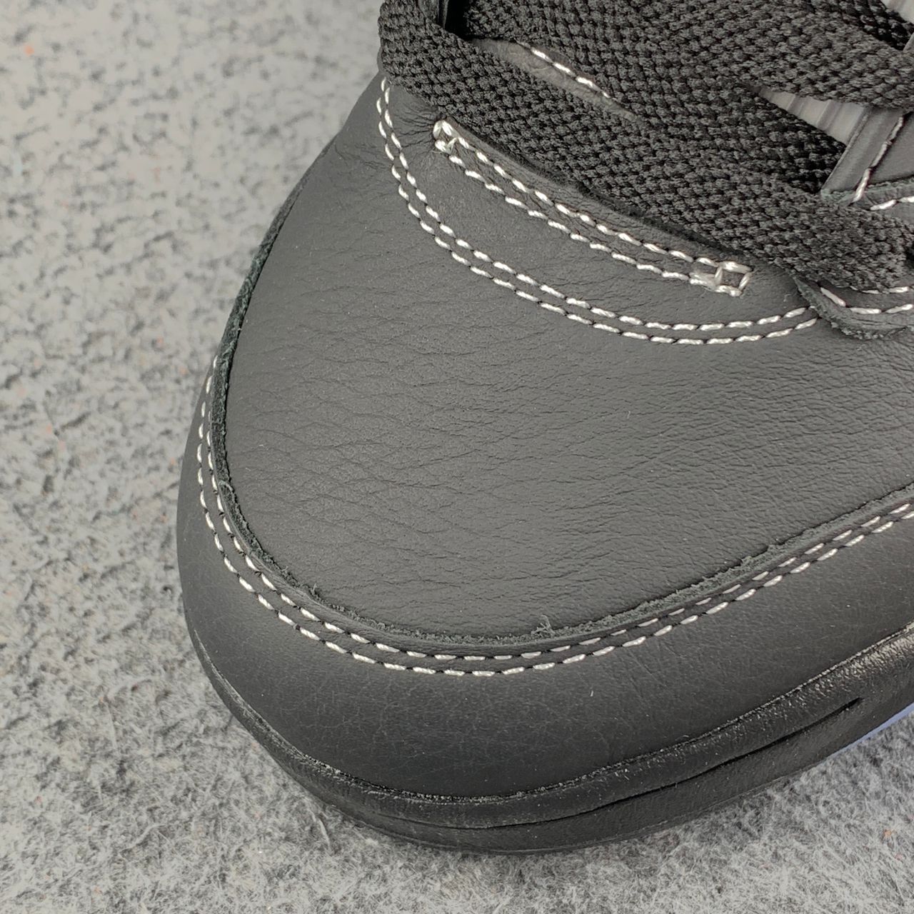 The Awake NY x Air Jordan 5 Retro 'Boro - Racer Blue' reunites the partner brands on a reimagined AJ5, featuring a black tumbled leather upper with contrast white stitching and 'Nike Air' on the back heel. A cut-out in the quarter panel netting forms Awake NY's 'A' logo, while dual Awake NY and Jumpman branding graces the silver reflective tongue in Racer Blue embroidery. 'NY' and '23' are embroidered on the lateral heel of the right and left shoe, respectively.