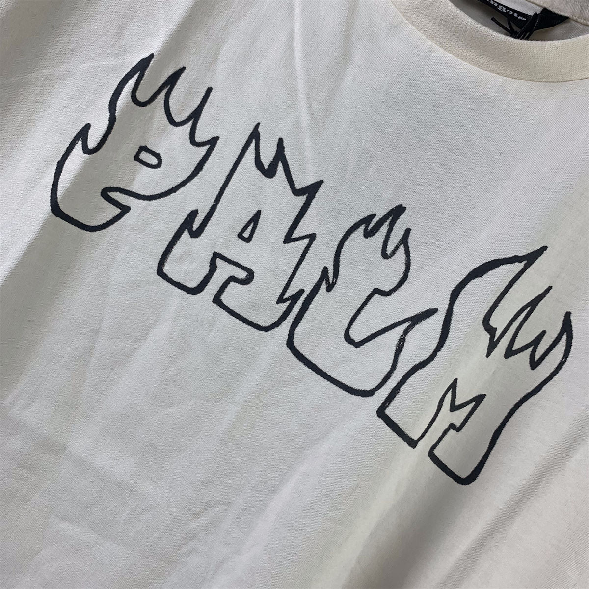 This white cotton jersey T-shirt features a bold palms and skulls print on both the front and back, creating a striking, edgy look. The black logo is prominently displayed on the front and back, adding a signature touch. Designed with drop shoulders and a classic crewneck collar, this T-shirt offers a relaxed fit and contemporary style.