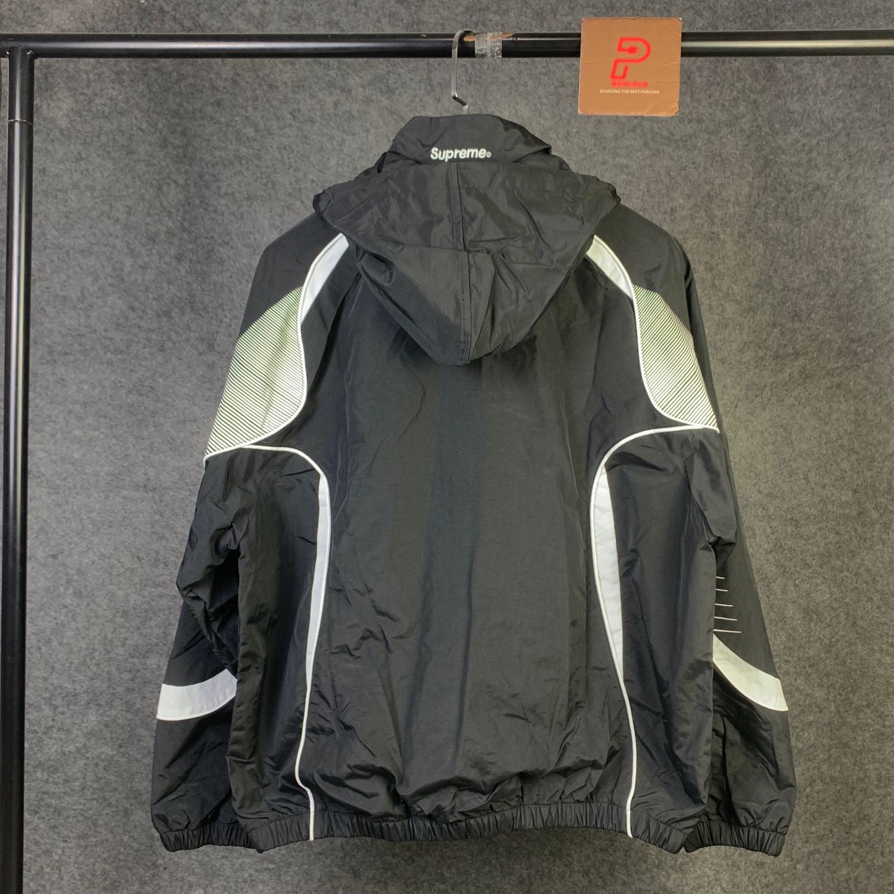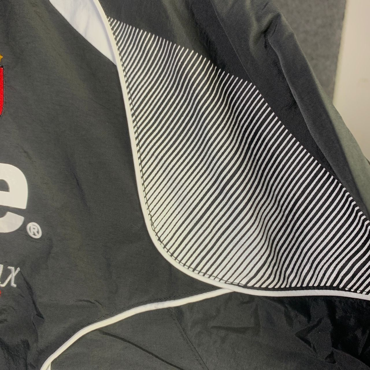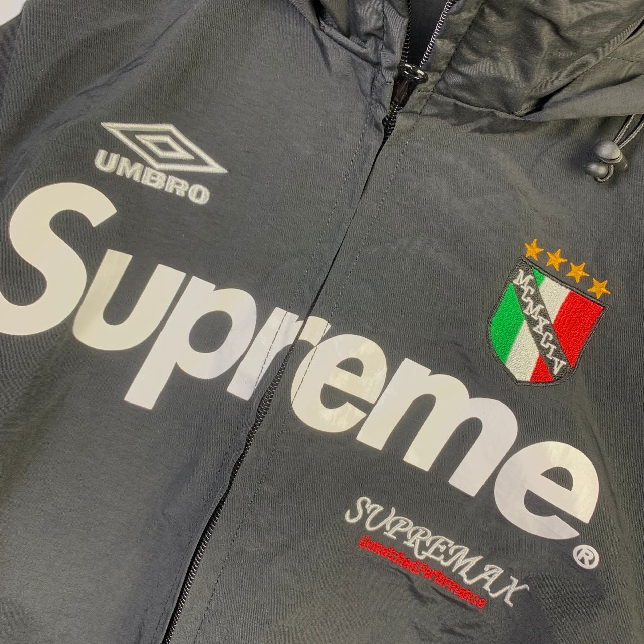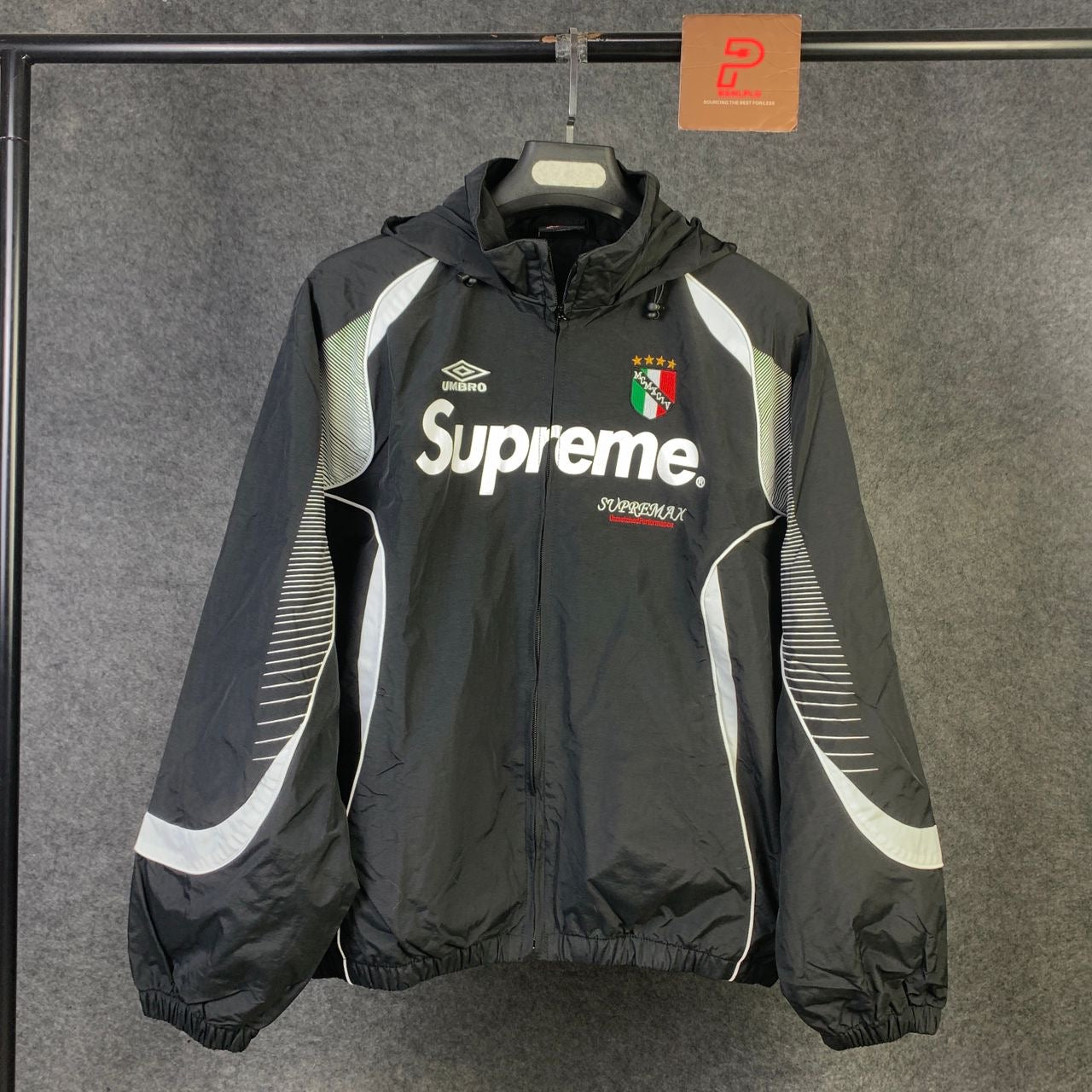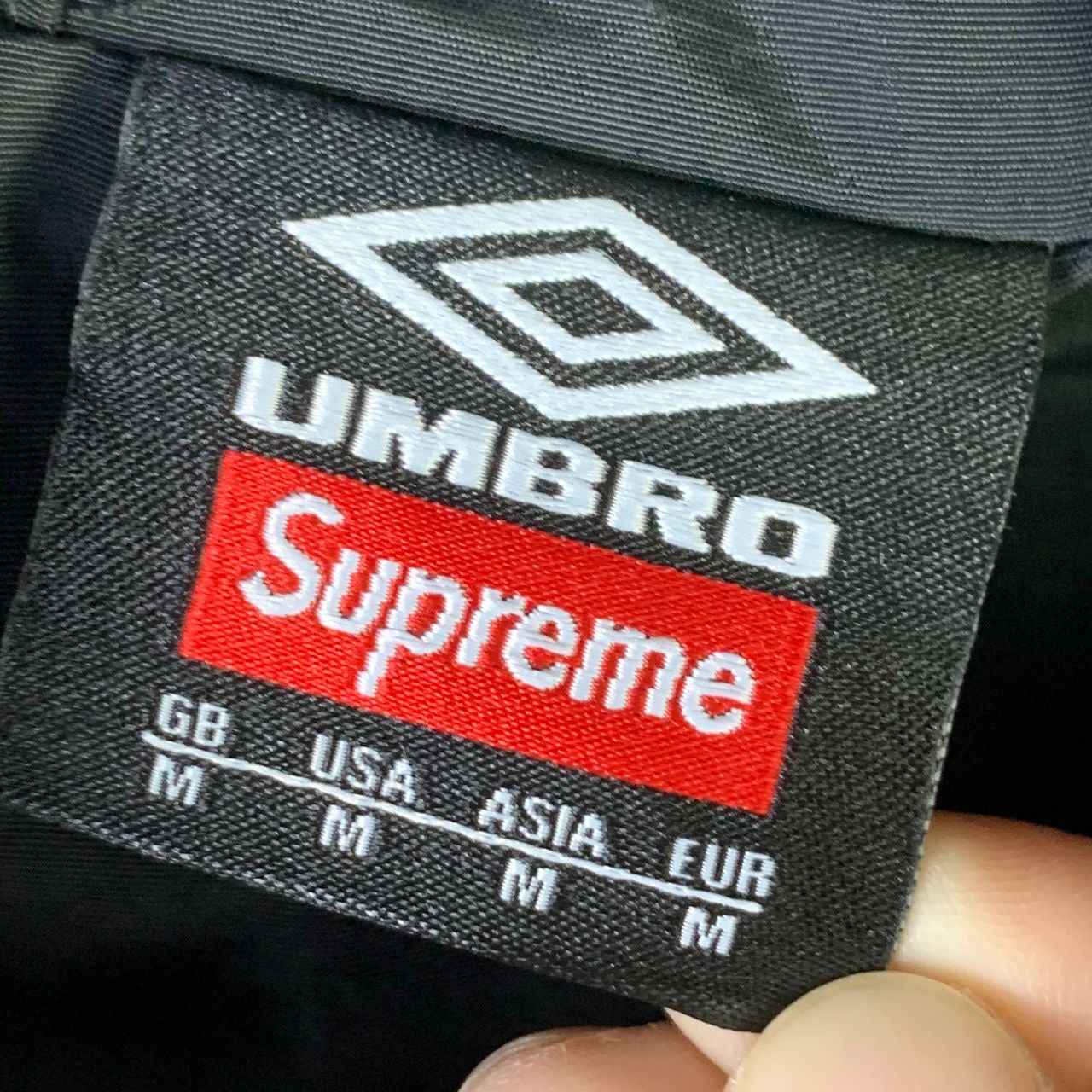 The Supreme Umbro Track Jacket in Black is a result of the collaboration between Supreme and Umbro. It features the Supreme logo on the front and on the back of the collar, while the Umbro logo is positioned on the upper right side. This jacket is entirely black with white stripes running across it, and it’s crafted from 100% nylon for a sleek and durable finish.