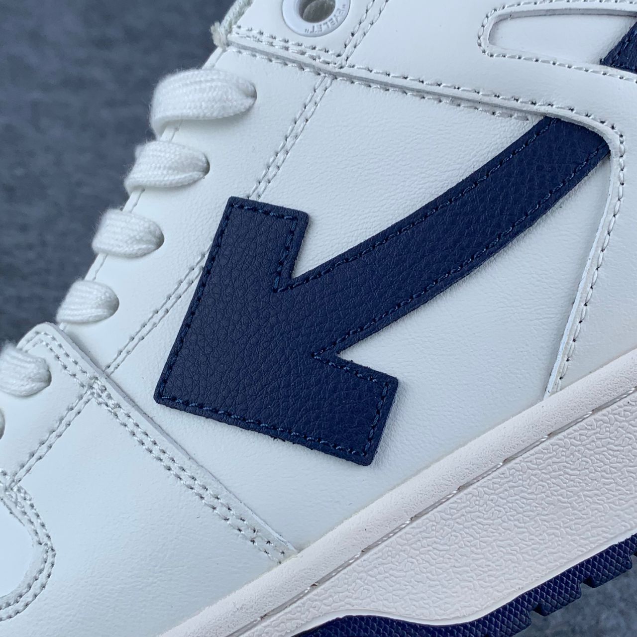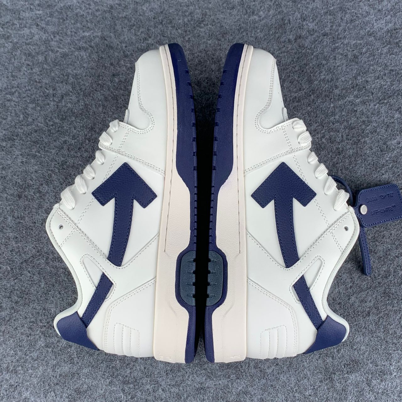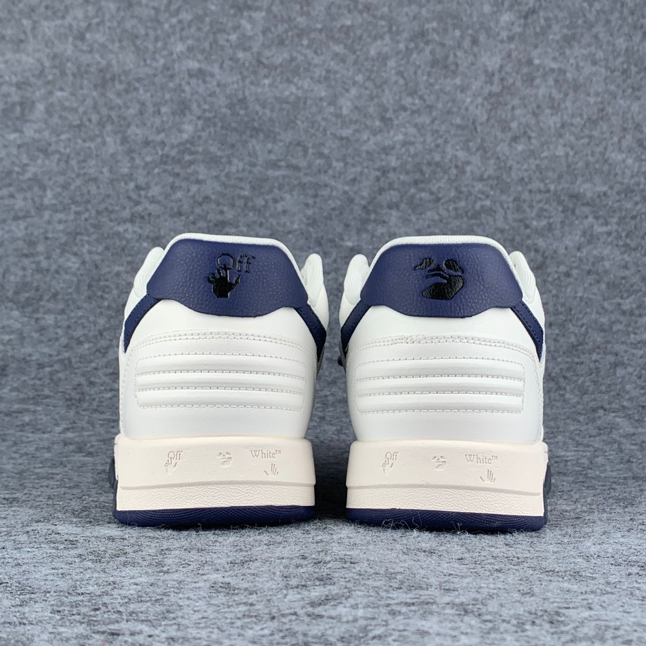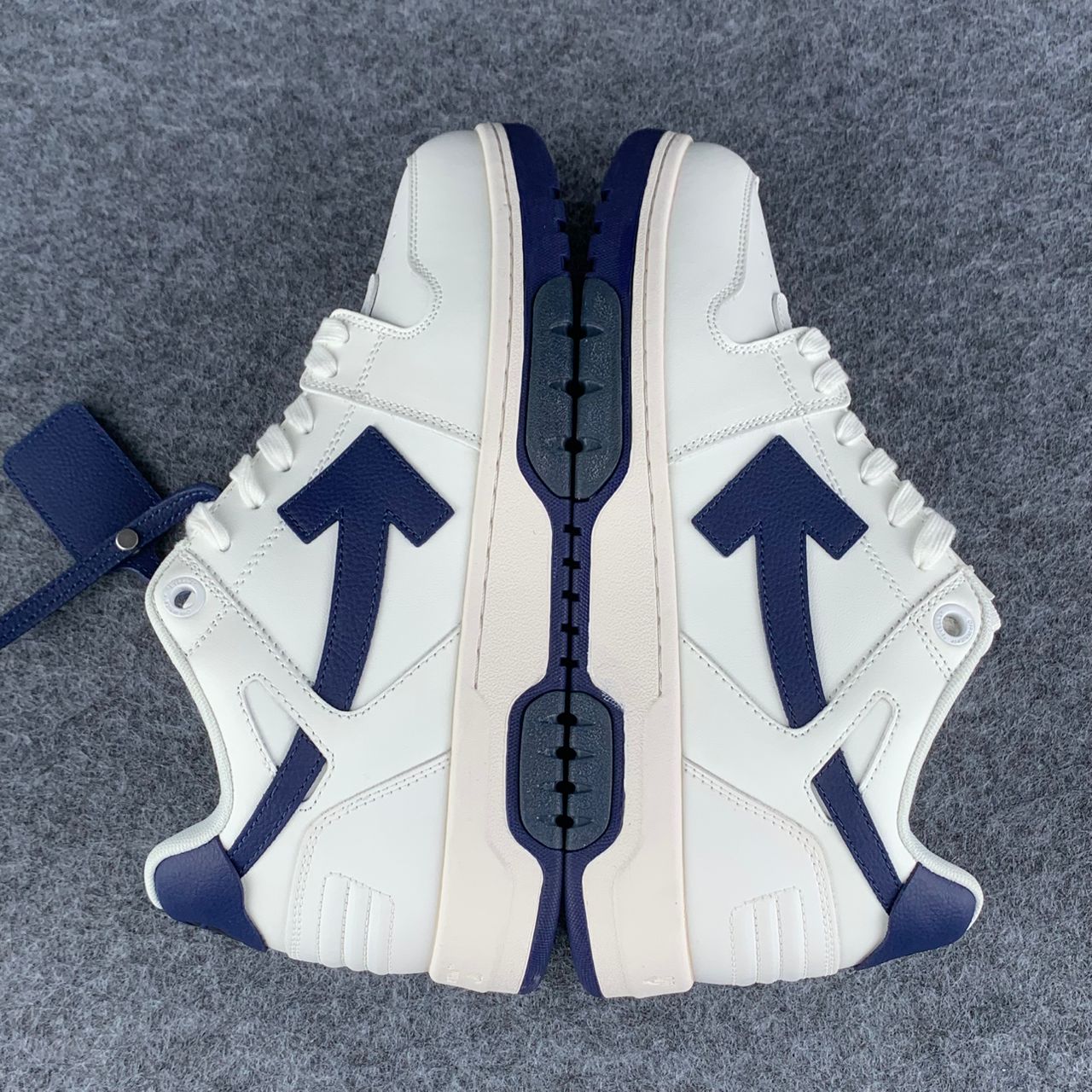 The Off-White Out of Office 'White White Navy Blue' features a crisp white leather upper with tonal white overlays and navy blue accents, including the brand’s signature arrow logo. The pair retains key OOO details such as a padded collar, perforated toe box, and exposed stitching. A sturdy rubber cupsole completes the clean, refined look.