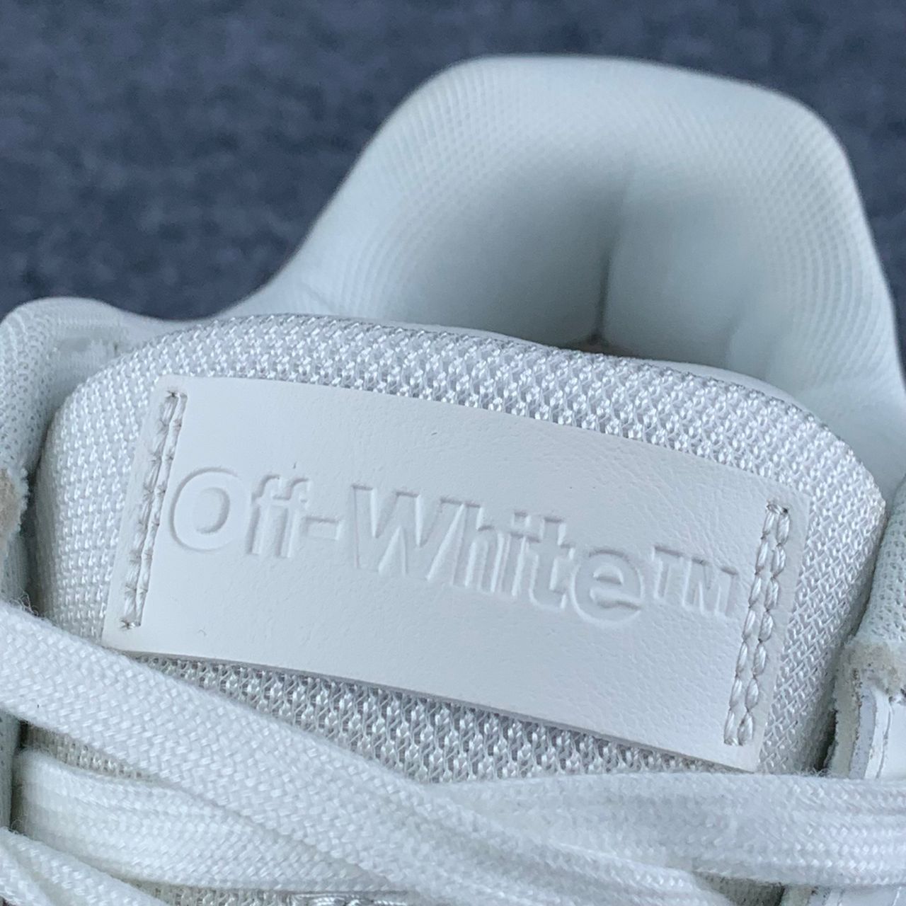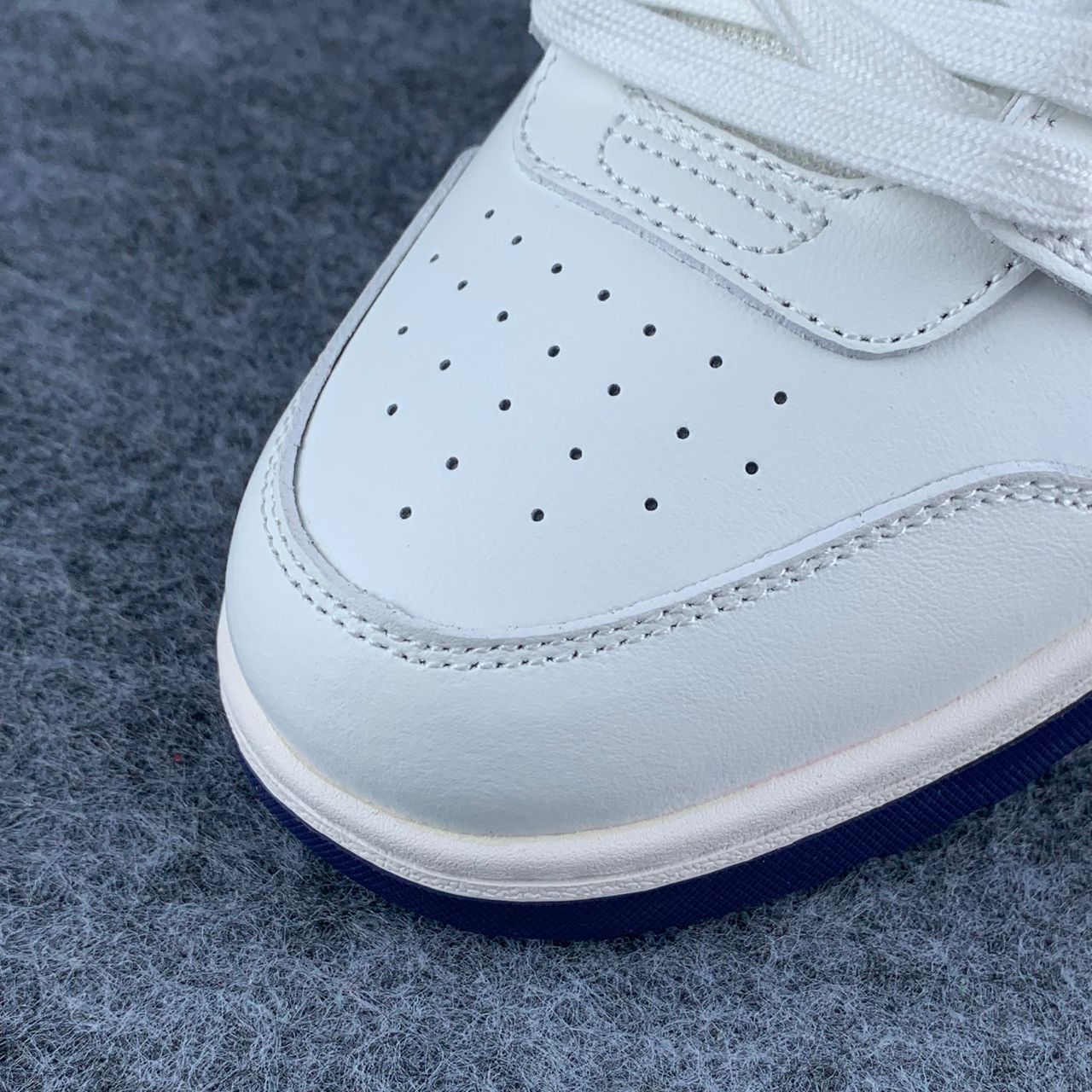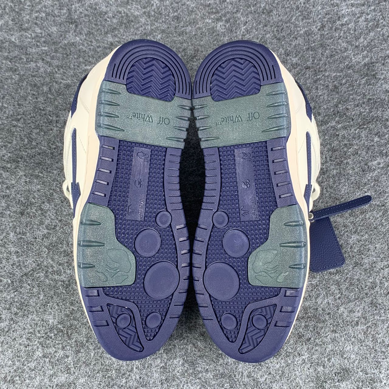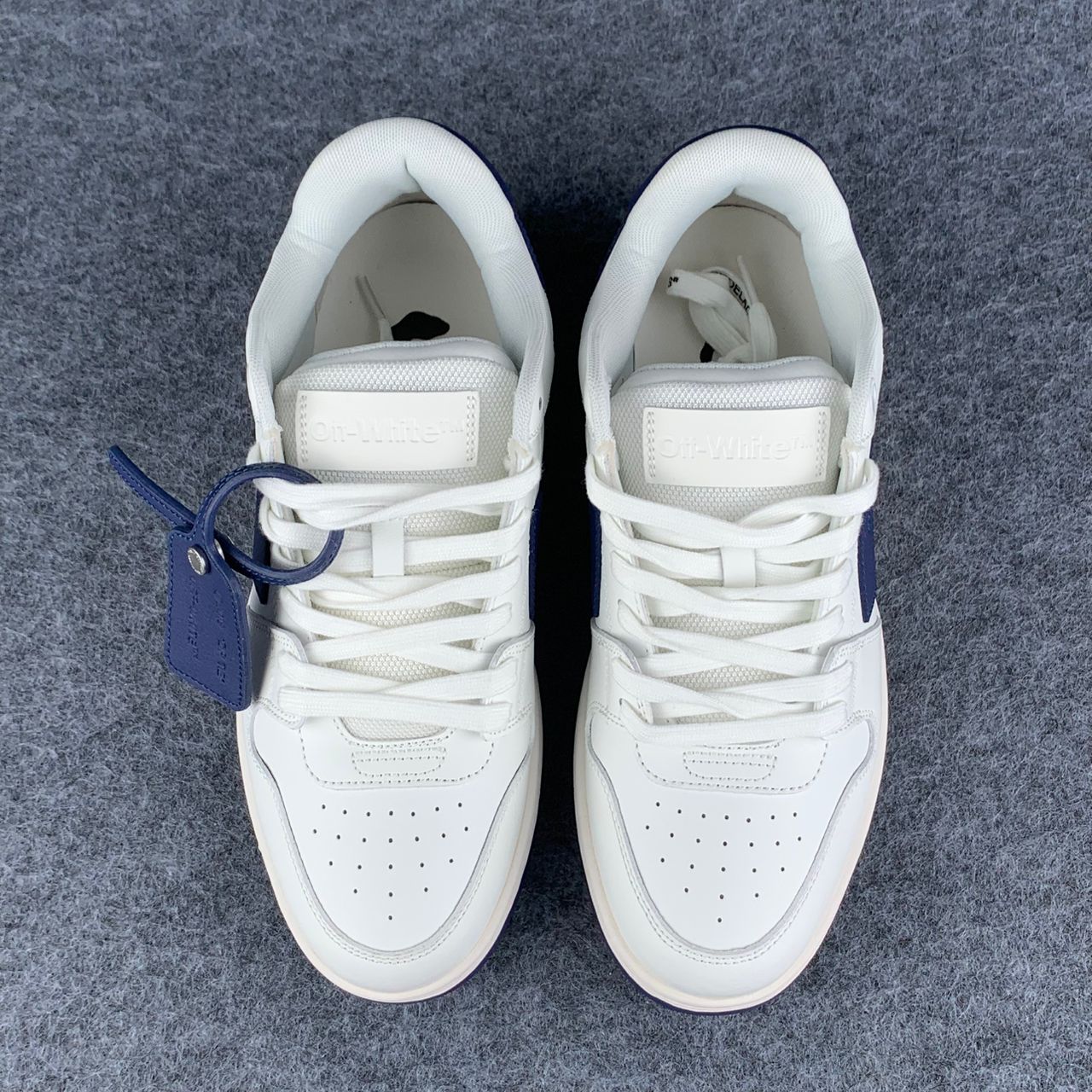 The Off-White Out of Office 'White White Navy Blue' features a crisp white leather upper with tonal white overlays and navy blue accents, including the brand’s signature arrow logo. The pair retains key OOO details such as a padded collar, perforated toe box, and exposed stitching. A sturdy rubber cupsole completes the clean, refined look.