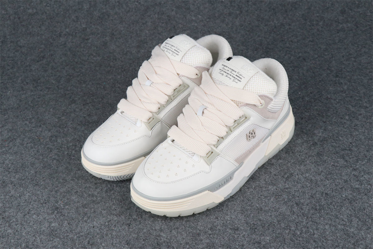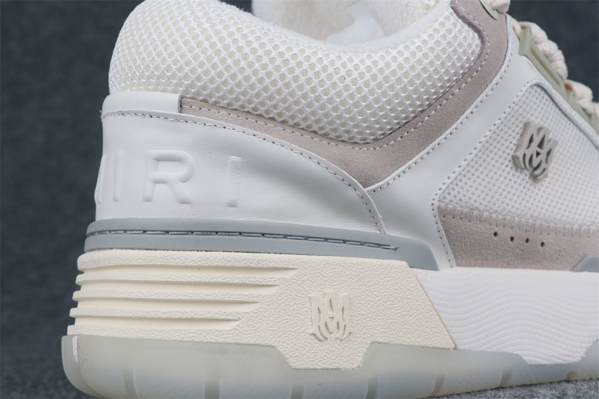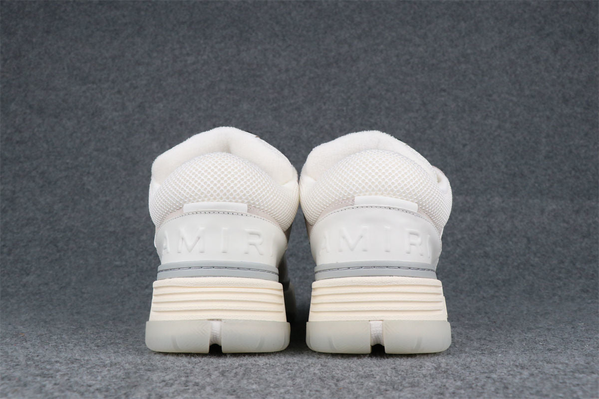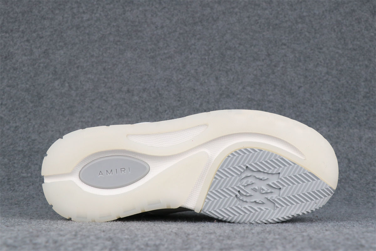 The Amiri MA-1 ‘Alabaster’ features a neutral-toned upper crafted from a mix of leather, mesh, and suede in soft cream and beige shades. Signature MA-1 details include the side-panel logo, perforated toe box, and layered construction that defines the model’s chunky profile. A padded collar and wide laces provide comfort and stability. The sneaker is finished with an off-white sculpted midsole featuring AMIRI branding and a translucent rubber outsole, delivering a clean, modern look in a refined monochrome palette.