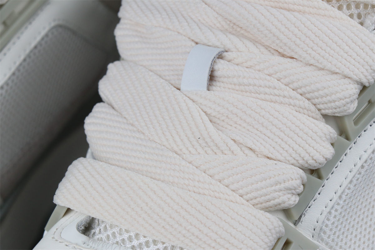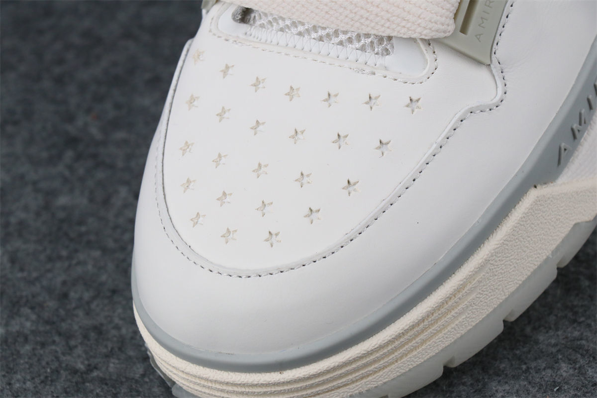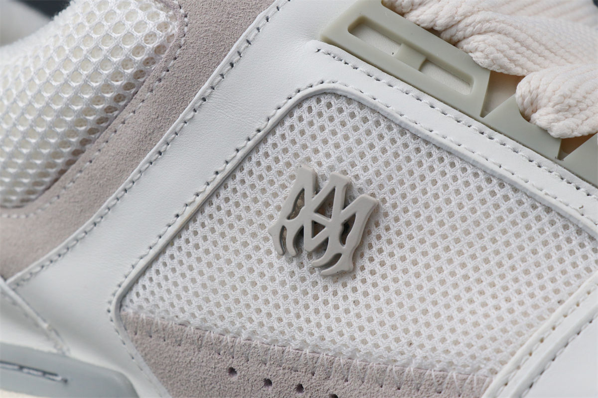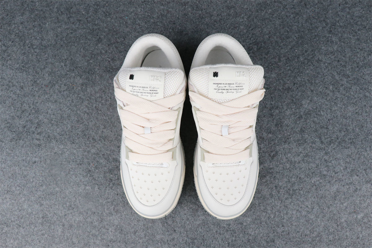 The Amiri MA-1 ‘Alabaster’ features a neutral-toned upper crafted from a mix of leather, mesh, and suede in soft cream and beige shades. Signature MA-1 details include the side-panel logo, perforated toe box, and layered construction that defines the model’s chunky profile. A padded collar and wide laces provide comfort and stability. The sneaker is finished with an off-white sculpted midsole featuring AMIRI branding and a translucent rubber outsole, delivering a clean, modern look in a refined monochrome palette.